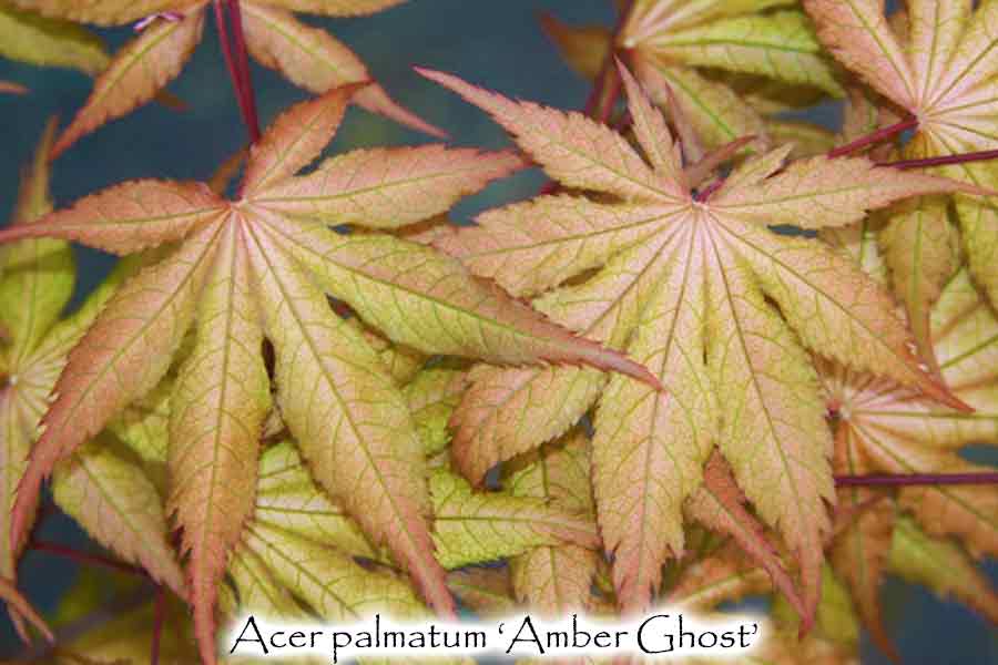 One of the 'Ghost' series discovered at the Buchholz Nursery east of Portland, Oregon, 'Amber Ghost' has very unique and stunning colors in the spring. When it first emerges, it is bright pink, then changing to a melon, pink-orange color. In summer it is a warm soft anber with rich red leaf petioles. In autumn it shifts to bright red and orange. The tree is somewhat vigorous, becoming 8 ft tall and 10 ft wide in 10 years. Hardy to zone 5.