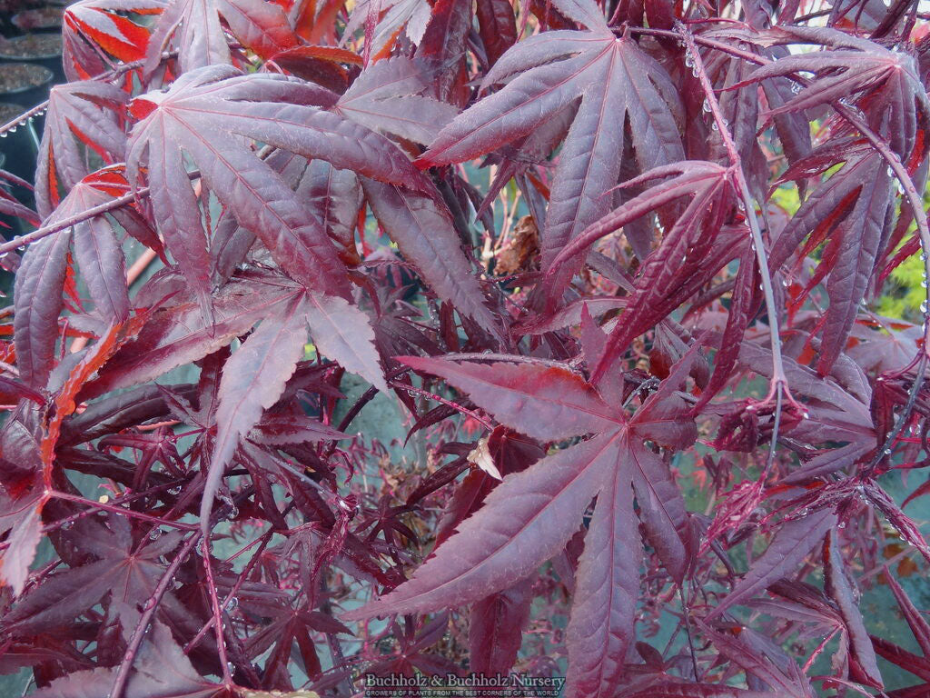 Always popular, foliage that is dark burgundy, approaching black, makes this Japanese maple a real winner! Introduced by the Buchholz nursery in Oregon, this tree will grow to 12 ft tall and wide in 10 years with a broad canopy. We are impressed with the very dark-purple leaves that come out in spring, then turn to red-purple in summer, followed by scarlet red in fall. Discovered and introduced by the Buchholz nursery in Oregon. Hardy to zone 5.
