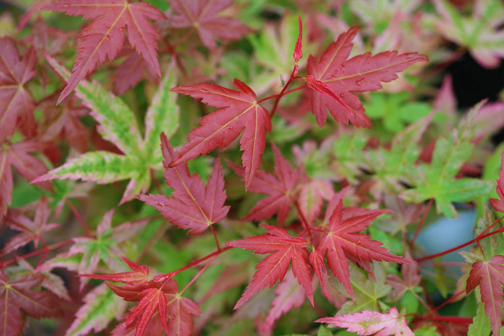 Acer p. 'Johnnie's Pink' is one of those with many colors through the season. In the spring, the leaves emerge bright pink, then slowly shift to bronze red, then to green for the summer. You can probably tell which month it is by the color of the leaves on this one. The tree will grow slowly to 8 ft tall and a bit less wide. The fall colors are red and orange. Hardy to zone 5.