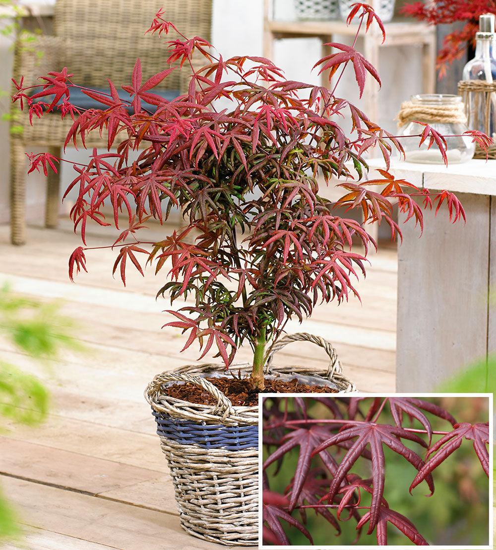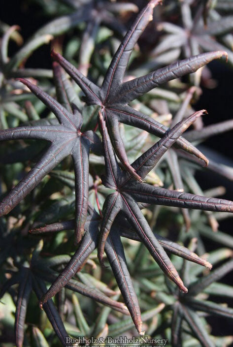 Unusual leaf shape on this one resembles a starfish, coming out pink in spring, then turning very dark red in summer, then intense crimson in fall. The tree will be 10 feet tall and 6 feet wide in 10 years. Hardy to -20 degrees F. Discovered by Vergeldt Nursery in Holland.