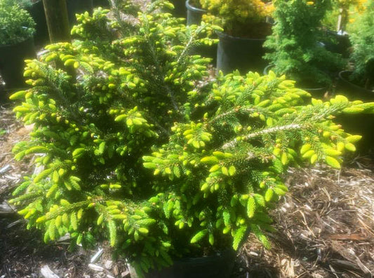 As the lower temperatures of December arrive, so does the golden-yellow frosting on this cute little pine. In areas where the winter temperatures are very low, this pine will turn orange. Summer color is green. Grows wider than tall. Very few available.