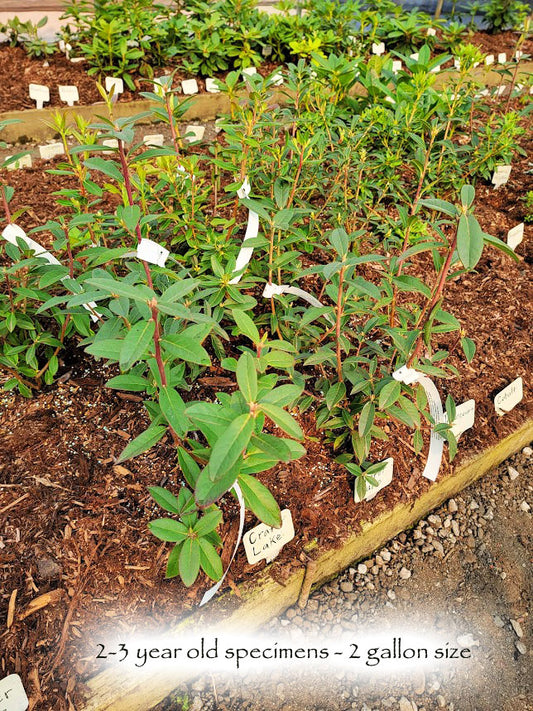 The flowers on this hybrid are a luscious apricot-peach color and look so good you will want to taste them. The plant has medium green leaves and grows upright. Each year the list of people requesting Apricot Fantasy grows longer but it has turned out to be quite difficult to root, keeping this in demand plant a rare find. We will keep growing them but numbers are limited each year. Sign up to be notified of the restock if this is on your must have list. Plant with Rhododendron Crater Lake for a real traffic stopper!