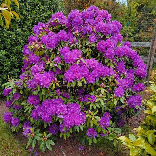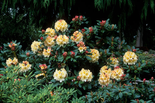 Developed by the late Halfdan Lem, and belonging to his 'Walloper' group of hybrids, this robust plant has 'basketball' size trusses of watermelon-pink with a dark cherry-red throat. There are white streaks and red spotting in each flower to add interest. The plant is a vigorous grower with very thick stems and leathery leaves, that are somewhat bronzy in new growth. Make sure you have room for this plant as it will fill a large space. We often recommend this one for screening as it will grow at least 8 ft. tall and wide. The flowering will be from ‘head to toe’, making a very memorable display.