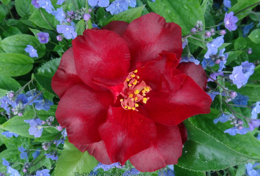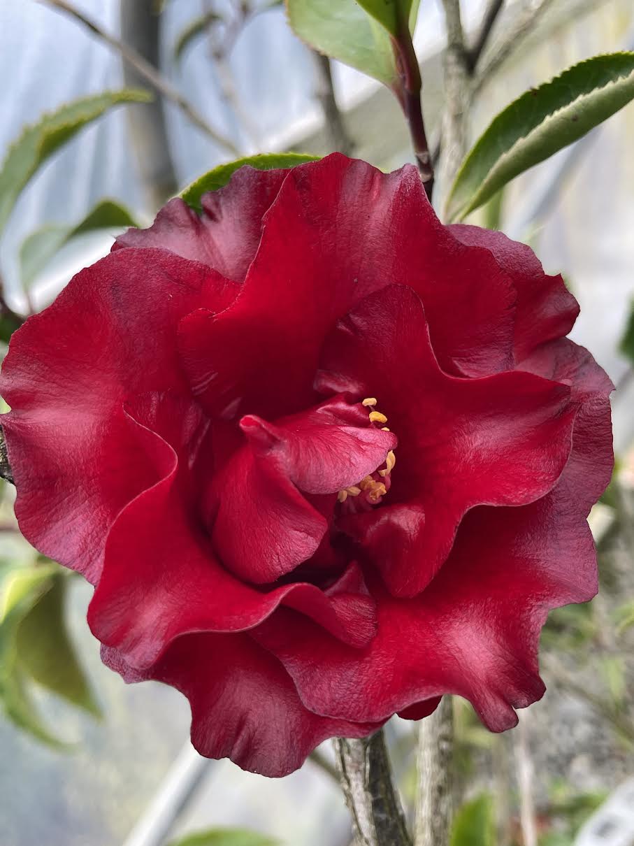 A large, vigorous growing Japanese Camellia with dark-red, almost black flowers. The petals contrast with the bright yellow stamens, adding interest. Glossy, semi-double flowers start out a deep red, then shift to a darker red with black veined markings. The toothed foliage is unique, and stays a rich green color throughout the season. Flowering is in mid to late season. Hardy to zone 7.