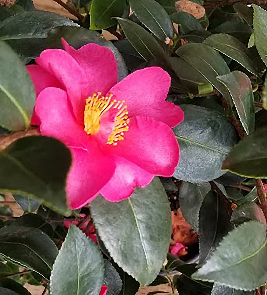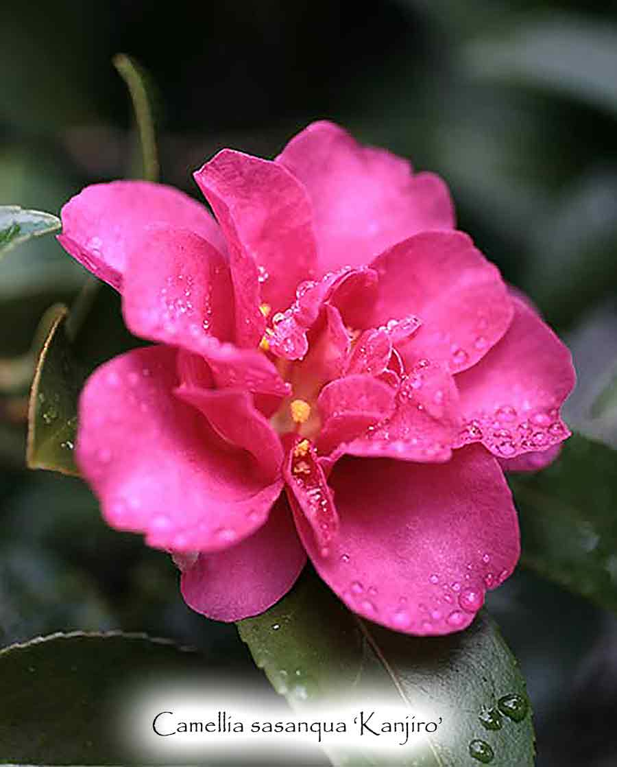 One of the sasanqua type of camellias that blooms in the fall, October to January, and has FRAGRANT flowers. The single or semi-double flowers are cerise pink to rosy red in color, shading paler in the center with creamy yellow stamens. Prefers partial or full shade, but will still grow well in areas with ample sun. The plant is fairly vigorous, evergreen, with glossy dark-green foliage. Hardy to zone 7.