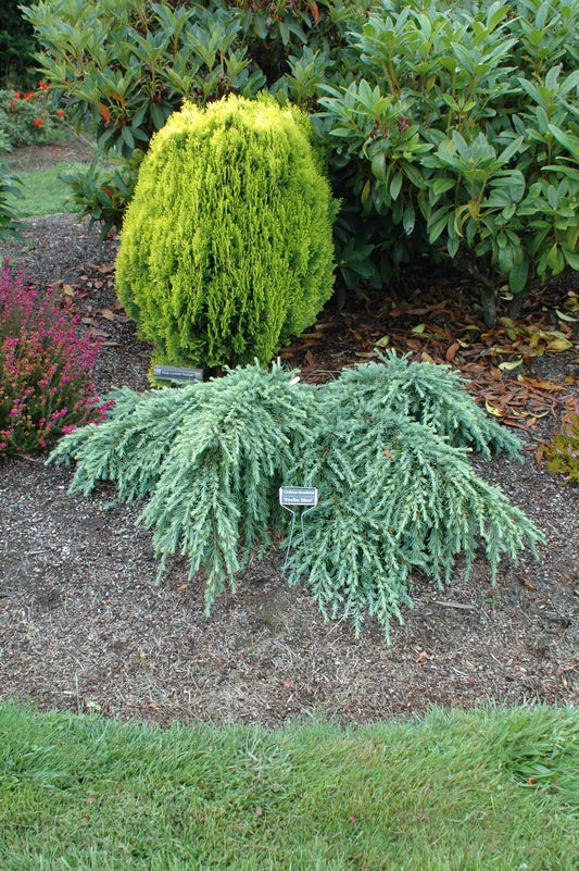 Finally a pine that challenges 'Chief Joseph' for color but is much easier to grow. Being a mugo pine insures that this dwarf conifer will grow slow and compact, will be hardy, and will take a variety of growing conditions. Even in full sun it will not burn, and is "school bus yellow" with orange tones in the winter months.