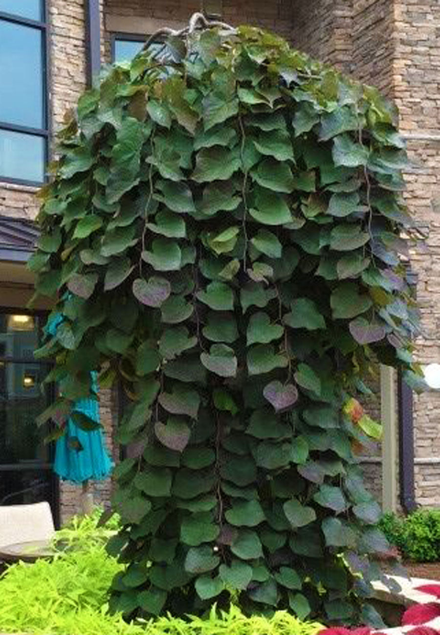 A new gem of a tree for small yards, Cercis canadensis 'Ruby Falls' will steal the spotlight in any yard that it is planted. Developed by crossing two stellar Redbud parents - 'Covey' x 'Forest Pansy', the tree exhibits showstopping character with dark rose-colored blooms in the early spring that last for several weeks. Then the new maroon-red colored leaves join the show on branches that weep and are held close to the stem. The texture is excellent and will contrast with many other plants, drawing the eye. Late in summer the burgundy leaves turn a dark green with a bit of maroon remaining. Even in winter the structure of the tree will be a sculpture that is very decorative. Hardy to zone 5, -15 deg F, and will prefer a bit of shade in hot climates. Birds, butterflies and bees love this tree.