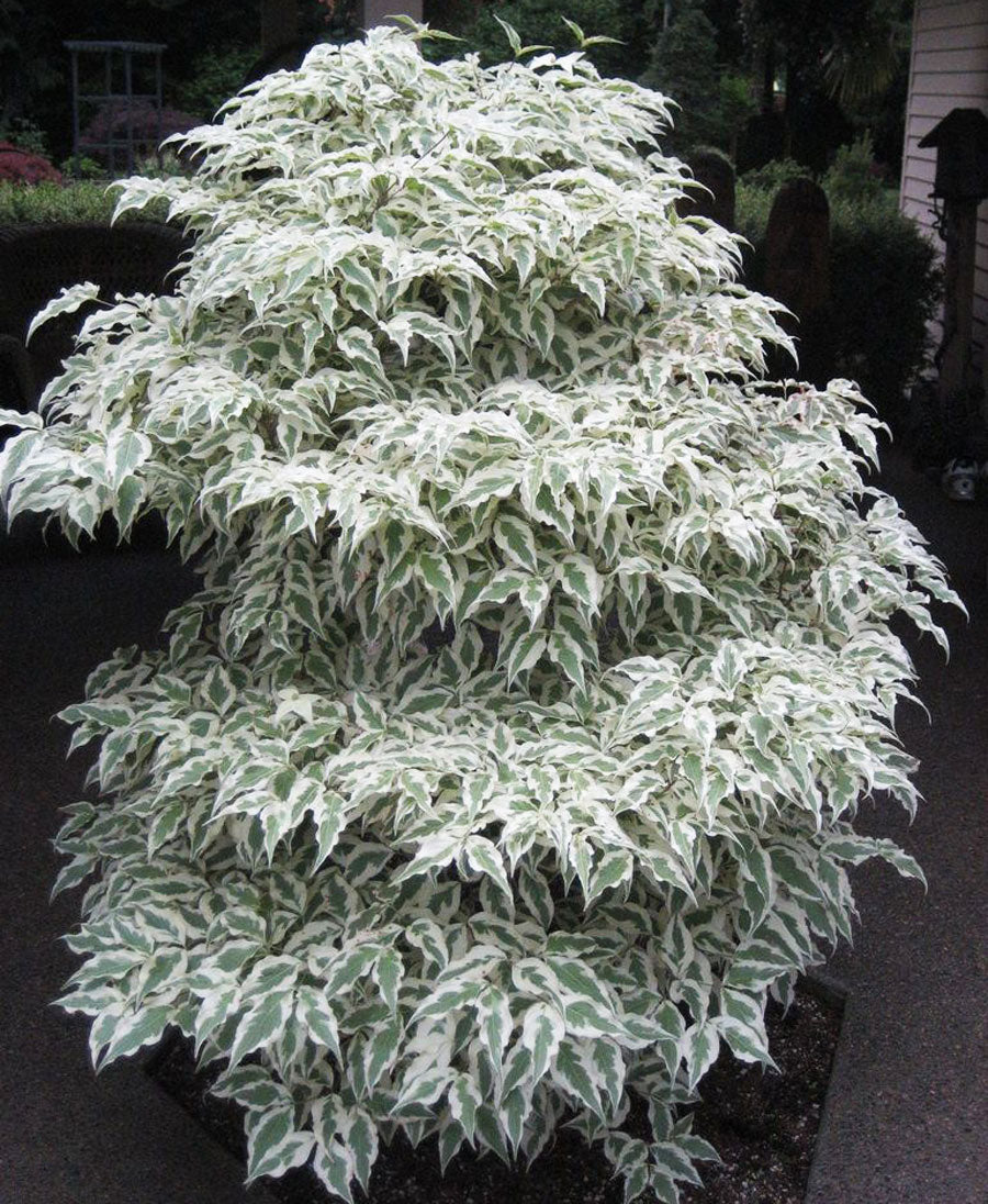 A very striking Korean dogwood with dramatic variegated foliage. When the leaves first appear there is a thin pink edge lining each leaf, adding interest and beauty. The white bracts cover the tree in summer, lasting for 5-6 weeks. Strawberry-like fruits form in late summer, attracting birds that feast on the fruits, keeping the ground clean. This tree will grow to 15 ft tall eventually, and be about as wide. A wonderful choice for a patio or yard tree.