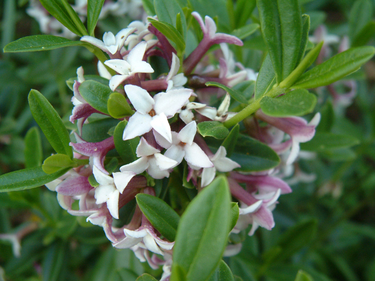 Probably the easiest to grow of all of the daphne. This plant was previously called Daphne retusa, but now has a new identification. The simple, leathery, shiny, dark-green leaves are 1-2 inches long on a dense and mounding shrub 2-3 ft tall and about as wide. The HIGHLY FRAGRANT flowers appear in dense, 3 inch clusters with purple-pink on the outside, and white with a pink tinge inside. Fruits in late summer, attracting birds. Plant in full sun to partial shade in well drained soil.