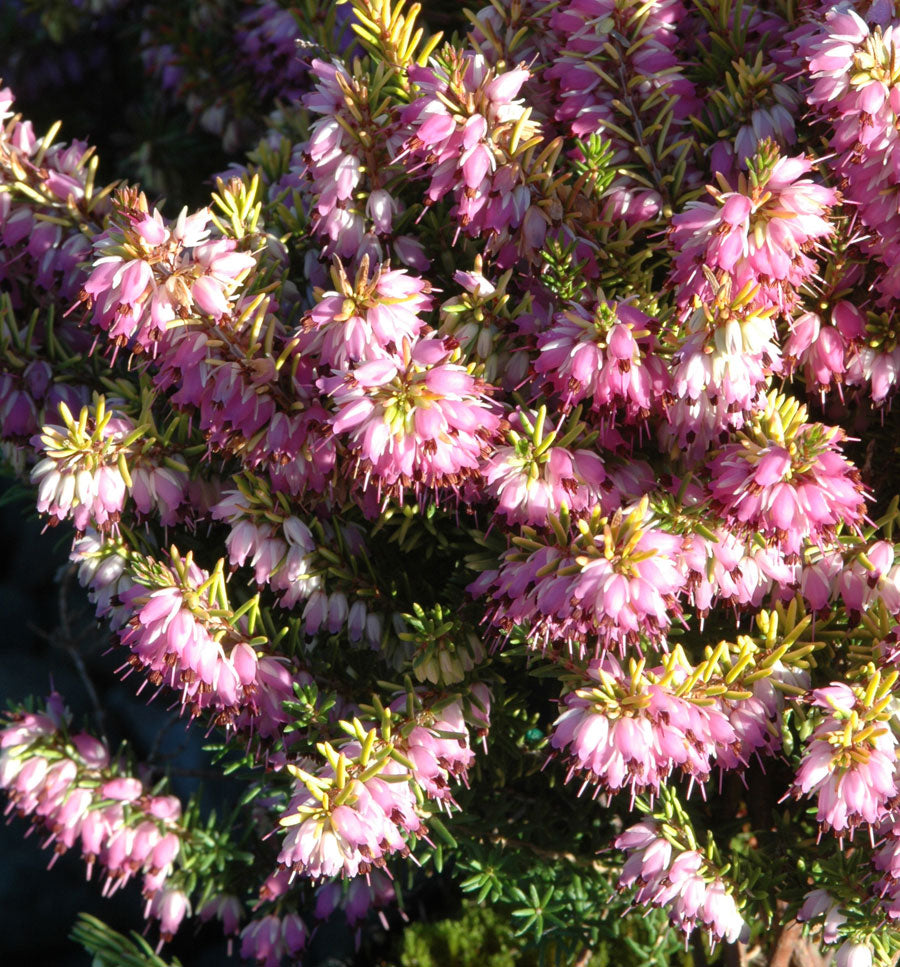This wonderful mounding/spreading winter blooming heath has richer pink flowers than most others of this type, adding color throughout February, March, and April. The foliage color is an interesting combination of yellow and orange, adding to its uniqueness. The plant will grow very bushy to 10 inches tall and 18 inches wide. Looks great planted with 'Jack H. Brummage'.