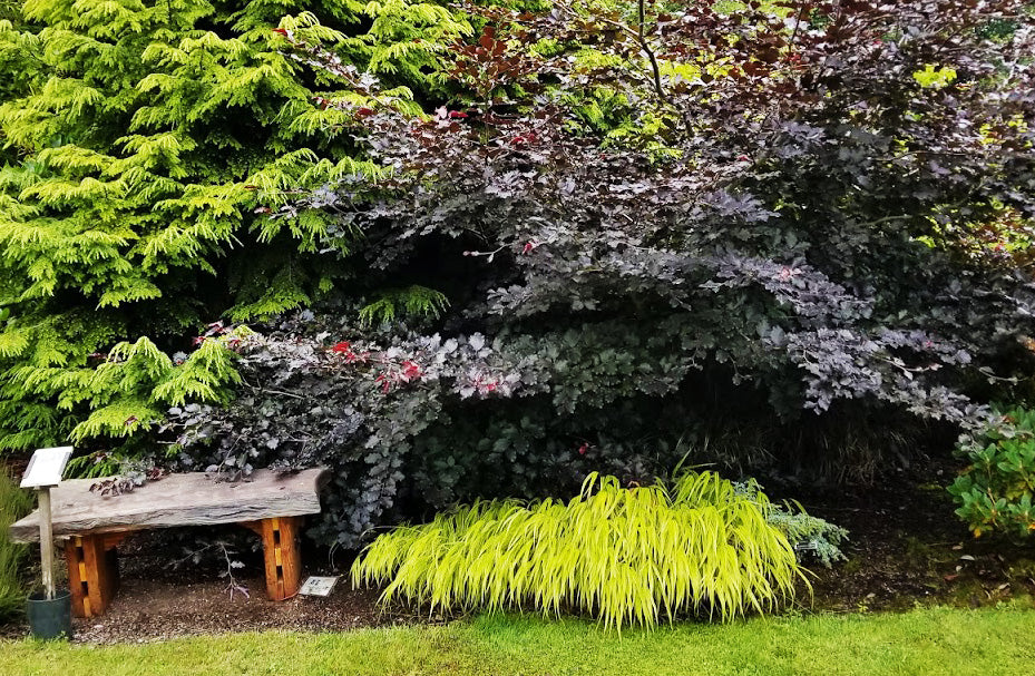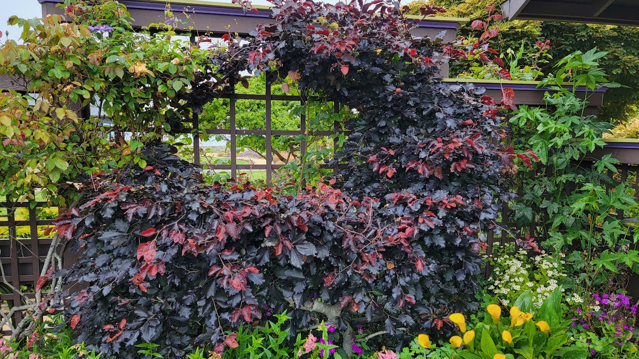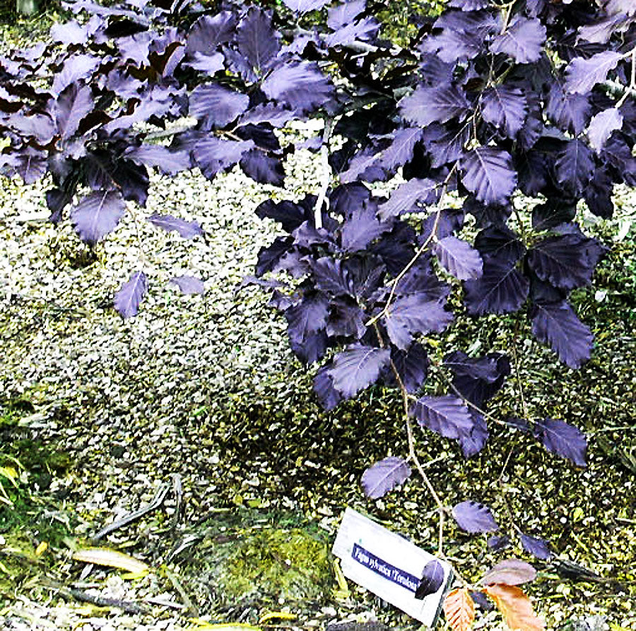 Always asked about in our gardens, this shrubby Beach 'Tortuosa Purpurea' has almost pure black leaves throughout summer and into the fall, when they begin to turn black-red. When light colored foliage plants are positioned in front of this magnificent plant, the effect is startling. Grasses like 'Evergold' will really 'pop' when planted in front of this Beech. Rarely available, but now we have a few. I have listed this plant in our 'tree' catagory even though it grows more like a shrub. This is so it will be grouped with the other Fagus cultivars. Also shown growing as an espalier in a local garden.