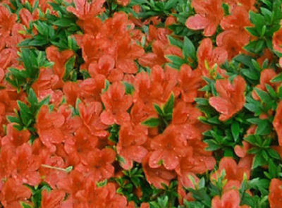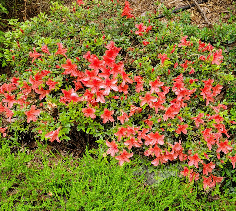 Useful ground hugging azalea that tolerates quite a bit of sun. The flame-red-orange flowers cover this azalea in April-May. Seems to be dense enough to choke out weeds.
