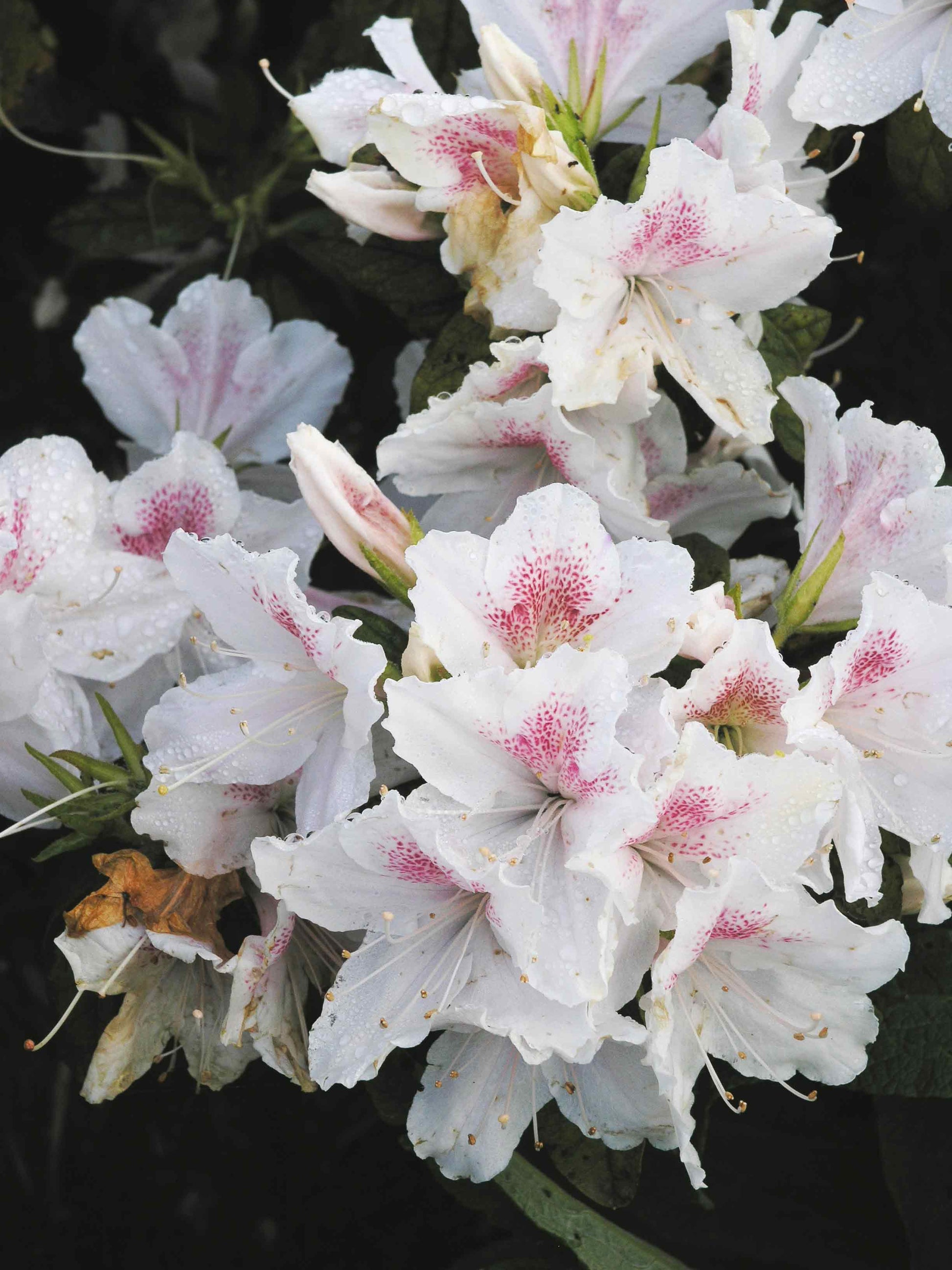 This nice low spreader has white flowers with pink spots and stripes and blooms in April. Repeat bloomer. One of a group of Southern Indian (Indica) hybrids.This hybrid group was developed from a large collection of Belgian Indian hybrids in the Southeastern US around 1870. It is a mixed group, including forms and hybrids of R. indicum X R. simsii and 'Mucronatum' forms X R. indicum. Early bloomers are usually more upright and vigorous, while later bloomers are more compact and spreading. This group is sometimes referred to as "Sun Azaleas" because of their strong sun and heat tolerance. Hardy in Zones 8-10.