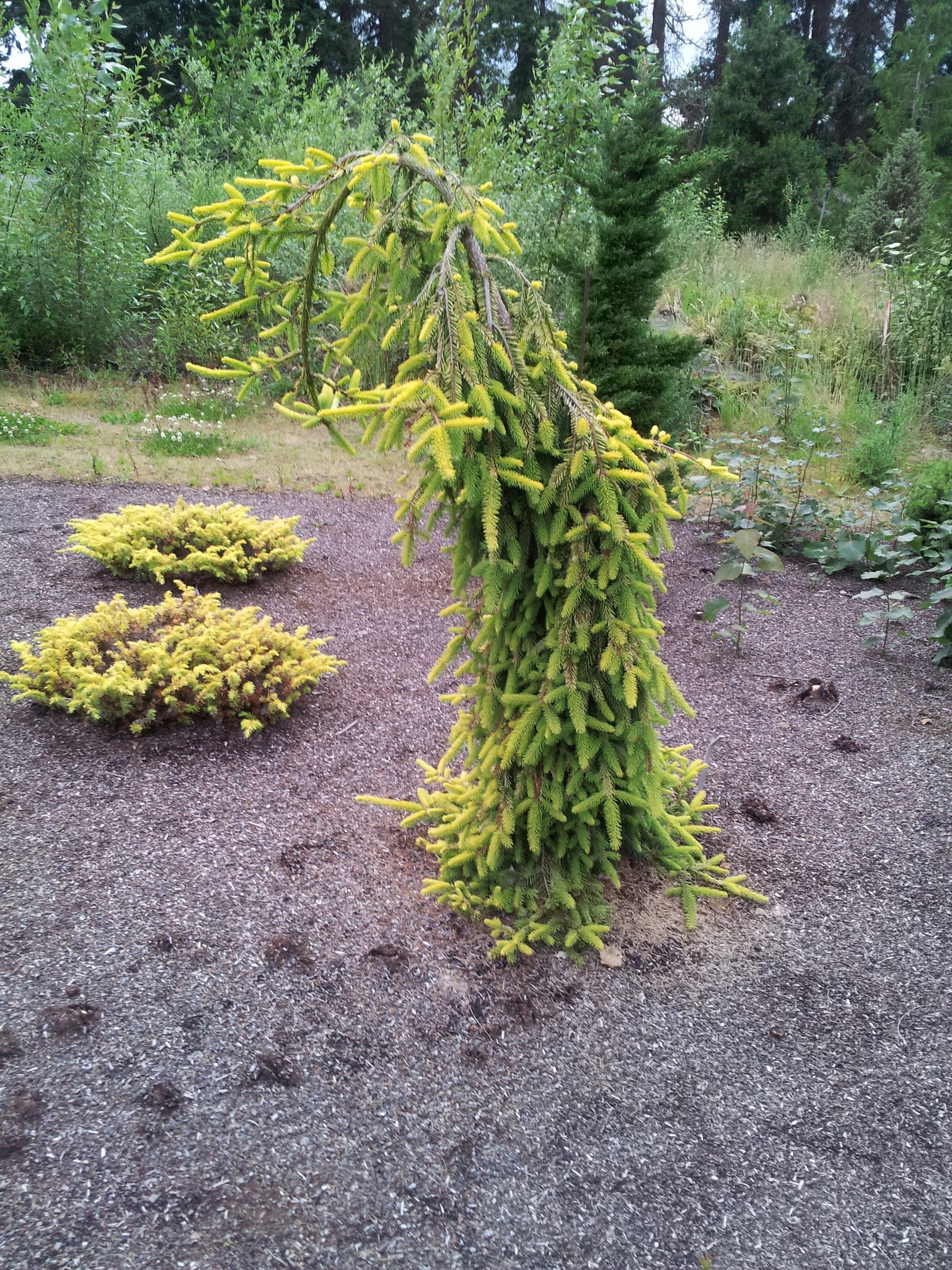 A gold form of the Norway weeping spruce. Most conifer lovers stake this tree to the height desired, then let it weep down. The new growth in spring is yellow-green, but turns bright gold by mid summer. Very showy! If you prefer it to grow flat as ground cover, then do not stake it. The foliage is more green in winter.