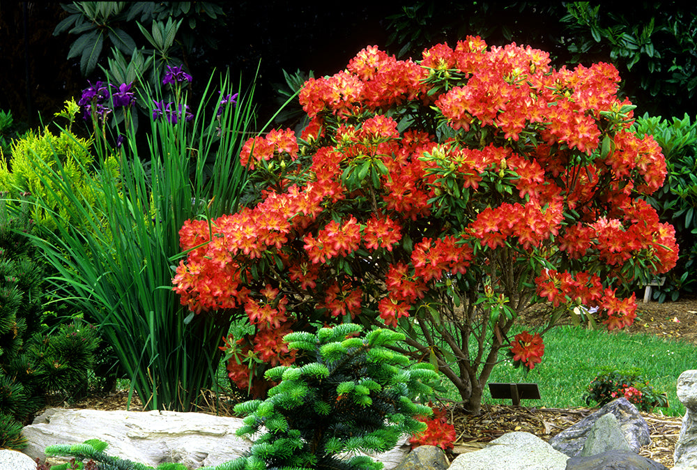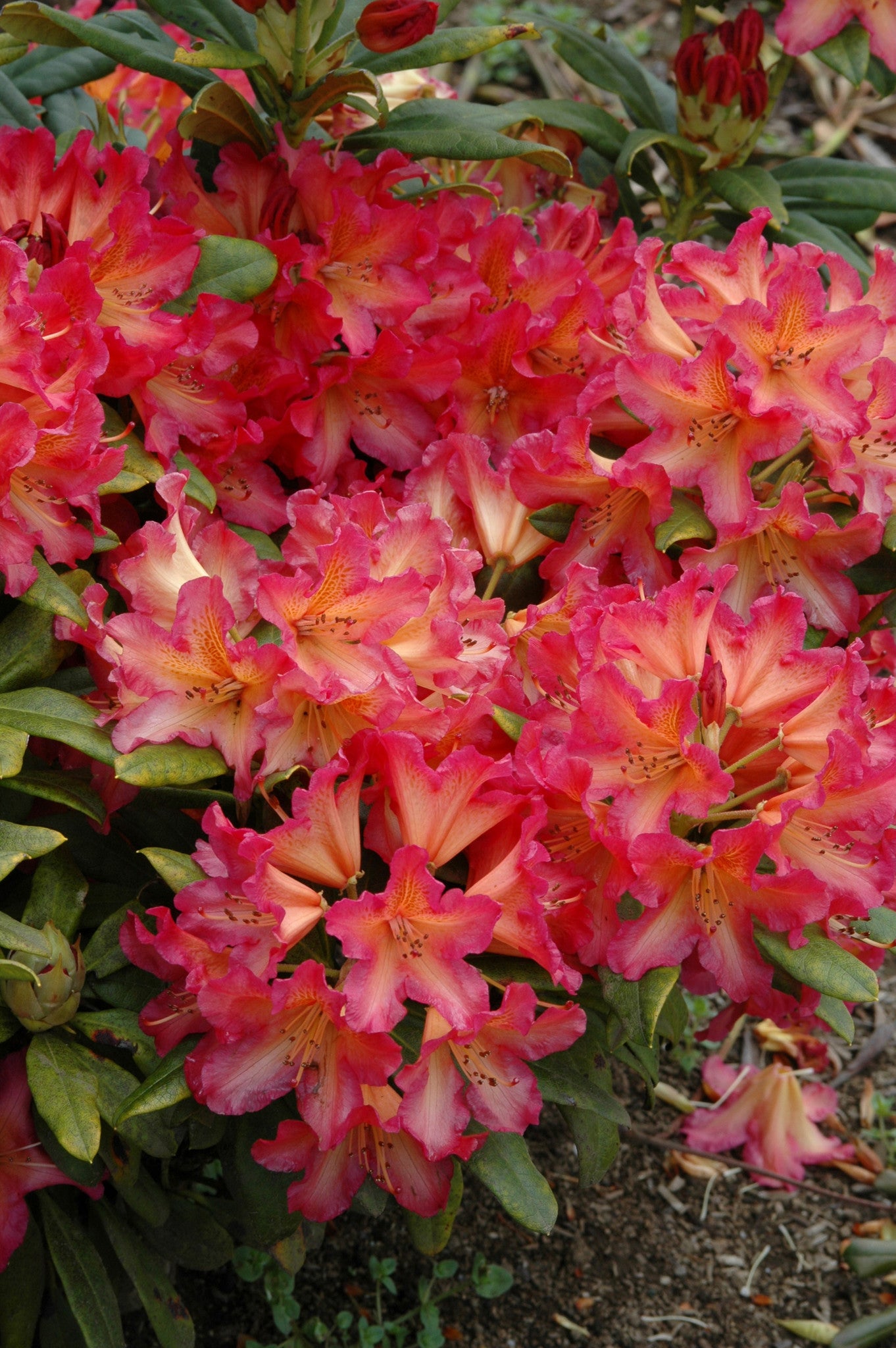 This unregistered hybrid of the species R. dichroanthum was found growing in San Francisco's Golden Gate Park, and since it was an exceptional plant, it was named 'Golden Gate'. This plant grows into a compact shrub of 3-4 ft. tall, and prefers more sun than shade here along the Pacific Coast. The blooming occurs in late April as it covers itself with flowers that are a combination of pink,orange, yellow, and cream. What a show!