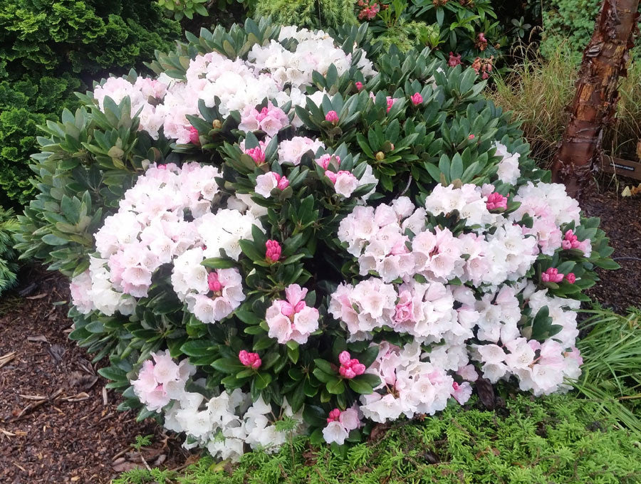 Created by the late Warren Berg, Golfer was named after his wife who was an avid golfer. Warren collected many of the most interesting foliage rhododendrons growing in asia and the Himalayan region throughout his life. Being a commercial airline pilot, he had many opportunities to see and collect these jewels. Later in his life he began hybridizing for more interesting foliage in rhododendrons. This hybrid is R. degronianum ssp. yakushimanum x R. psudochrysanthum. The flowers open a light pink, then turn white. The shrub is more well known for its blue-green foliage in late summer and through the winter, but in spring just after blooming the new growth comes out a very light gray with a dusting of 'tomentum' on the leaves. This is a prized feature by collectors, and is thought to perhaps be a natural insect proofing by the plant. The dusting comes off by mid summer leaving shiny, blue-green, leathery leaves. The plant in the photo is over 10 years old and is 2 ft tall x 3 ft wide. The growth rate is quite slow, so the plants we sell are small. A valuable addition to the rock garden, or as a contrast plant to other plants.