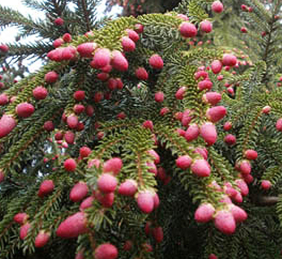 Growing 6" - 9" per year, this pyramidal form of Oriental Spruce is unique as it produces red male pollen structures on the ends of the branches in spring. The tree will also cone up well, adding interest in the late summer/fall.