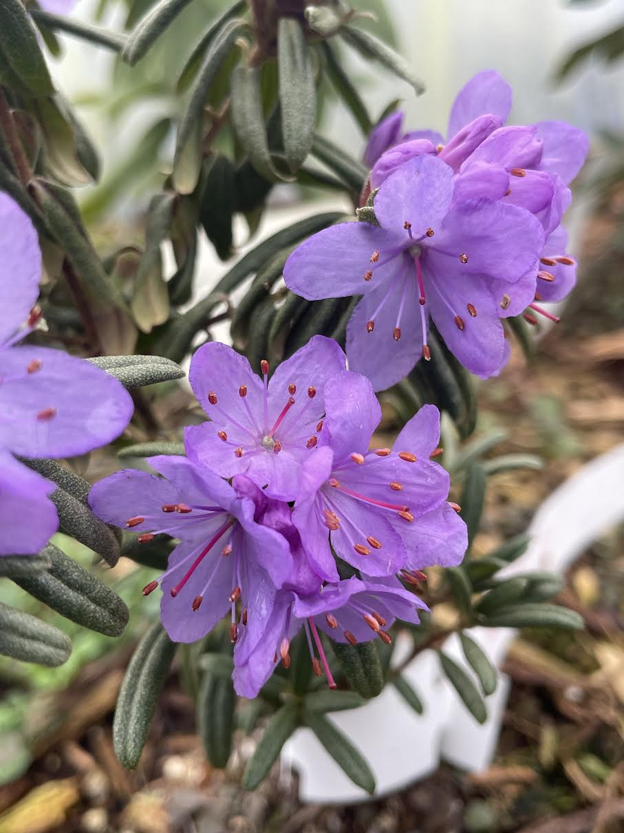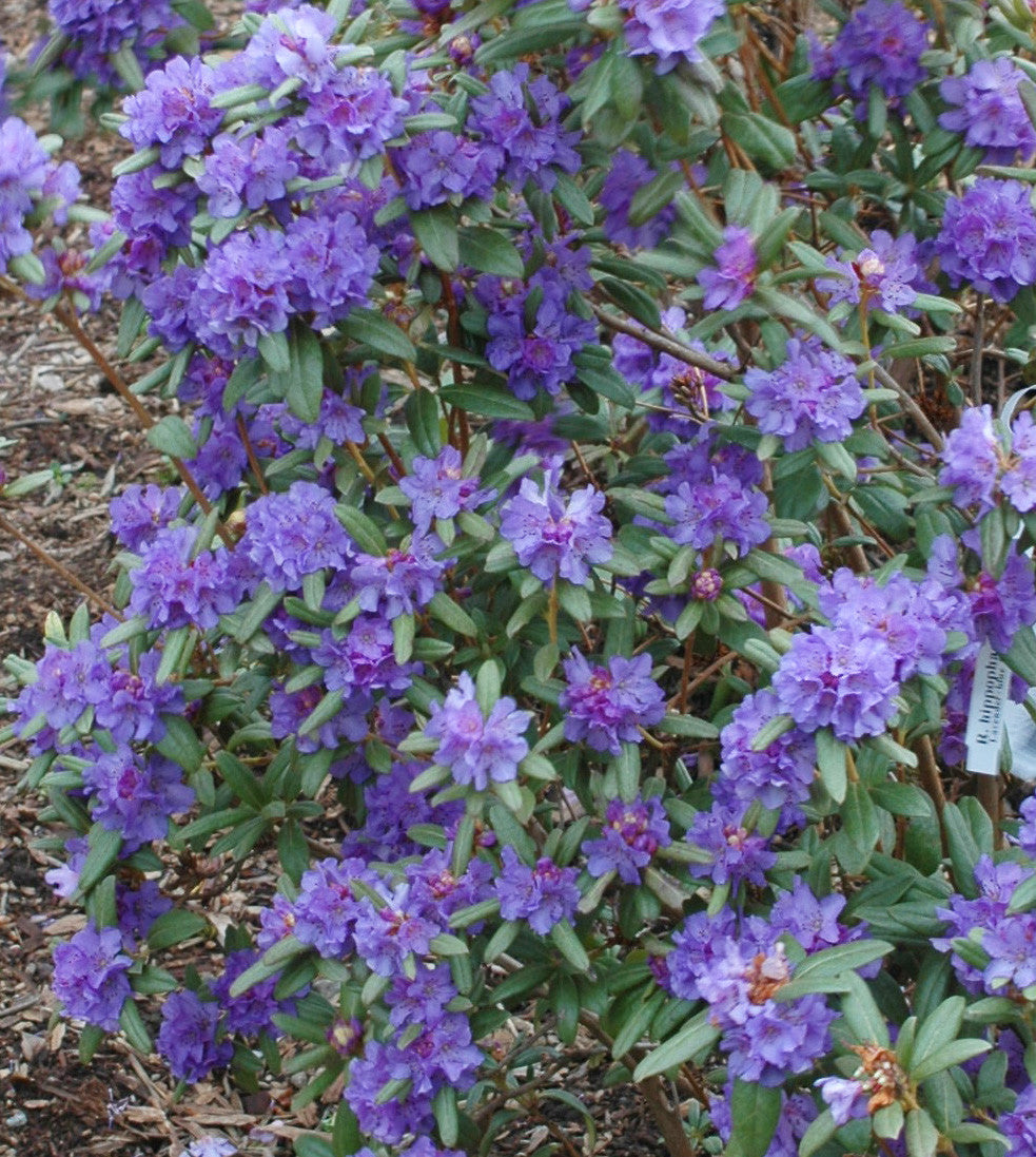 Much in demand at our nursery, R. hippophaeoides var. Haba Shan has wonderful blue flowers that delight the eye. Hardy to -10 deg. F, it is tolerant of sun and even swampy conditions. It will even withstand a hard frost when in full flower. The flowers are small tubular in shape, are a lovely lavender-blue, and seem to show themselves several times a year. The plant will only grow to 3ft x 3ft in 10 years, so it can go toward the front of the border for closer viewing. The foliage is small and has a spicy smell when handled. One drawback is that the winter temperatures cause the foliage to curl and look bad. As spring approaches, the plant takes on its more attractive foliage appearance. R. hippophaeoides is found growing wild in Yunnan and Szechwan provinces of China at 9,000-14,000 ft. elevation. One of our favorites, and we know it will be one of yours too.