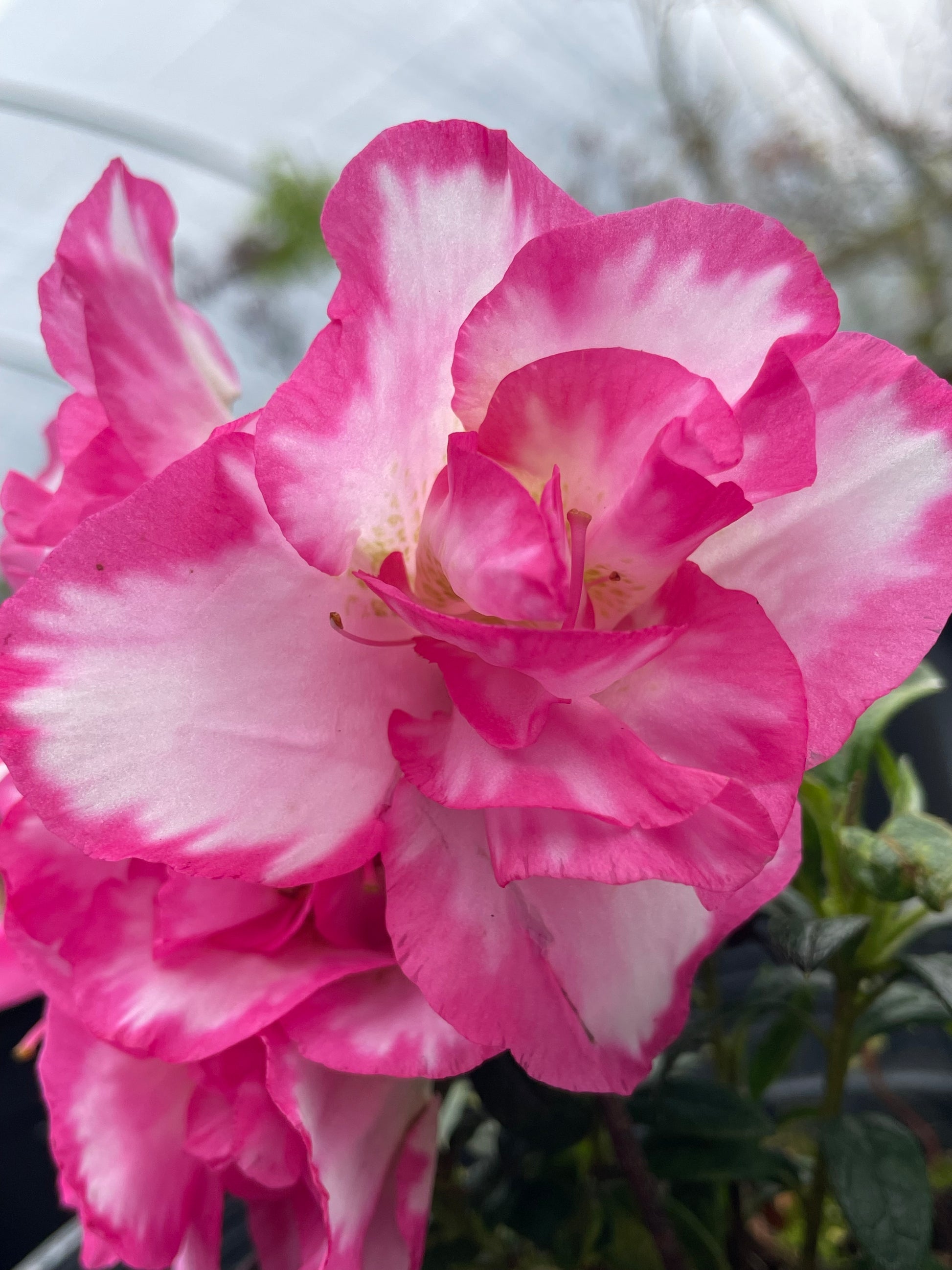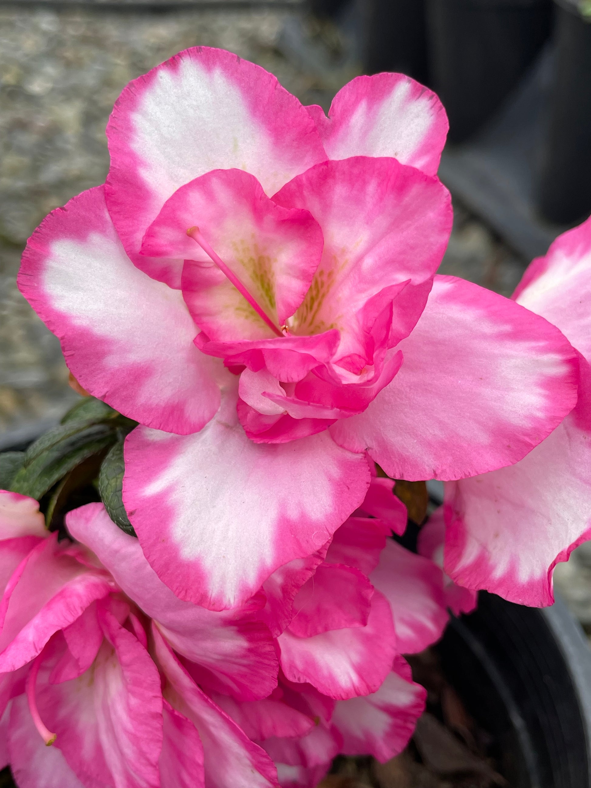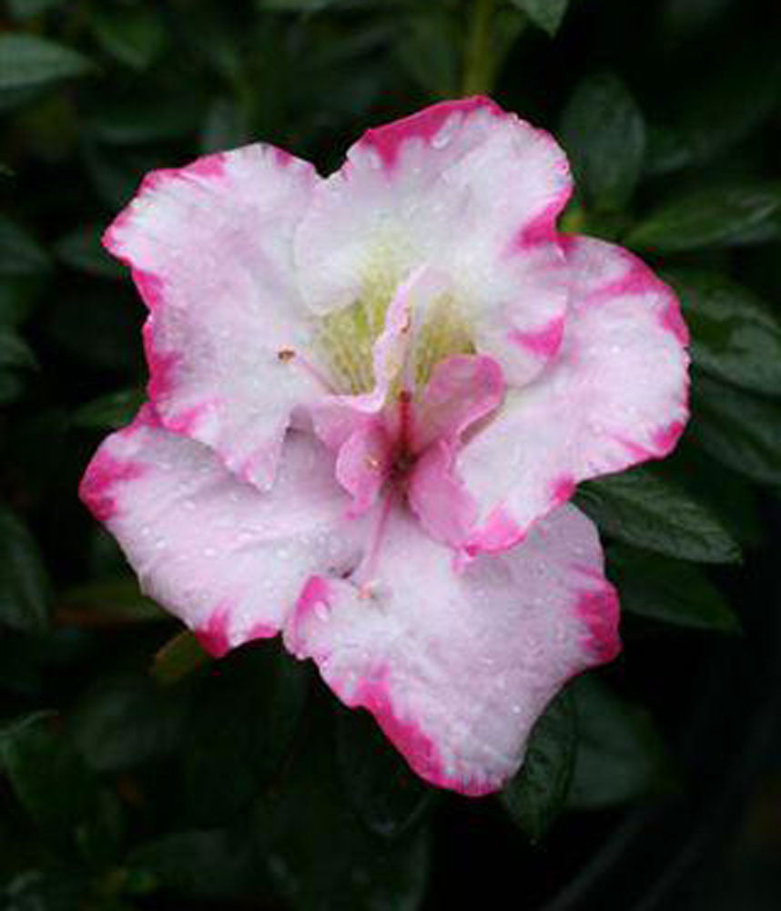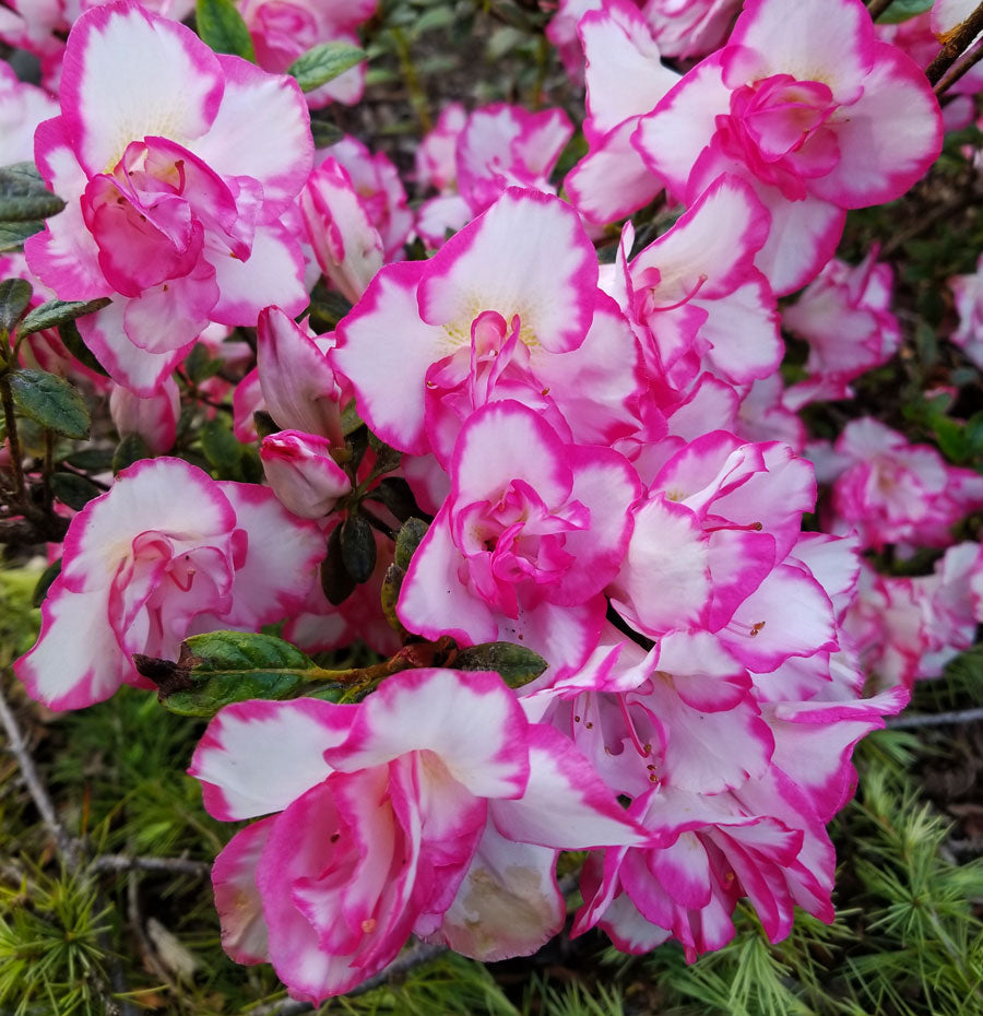 Bright white double flowers with bright magenta edges make this one of the showiest of the Evergreen Azaleas. Every time you walk by this azalea, you will say 'Wow'. The flowers tend to last, even in rainy weather.