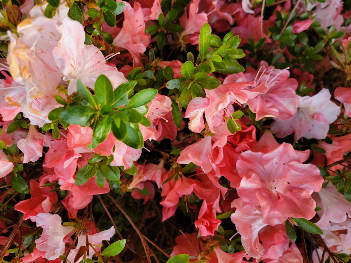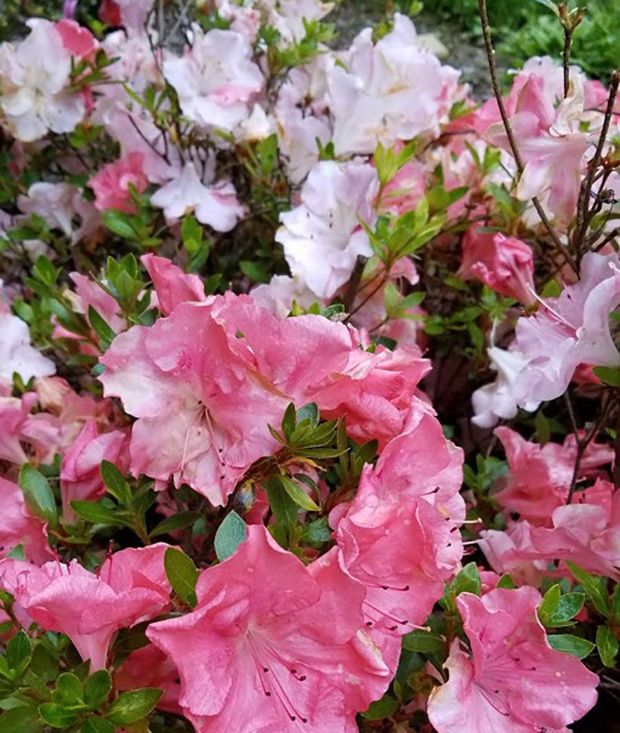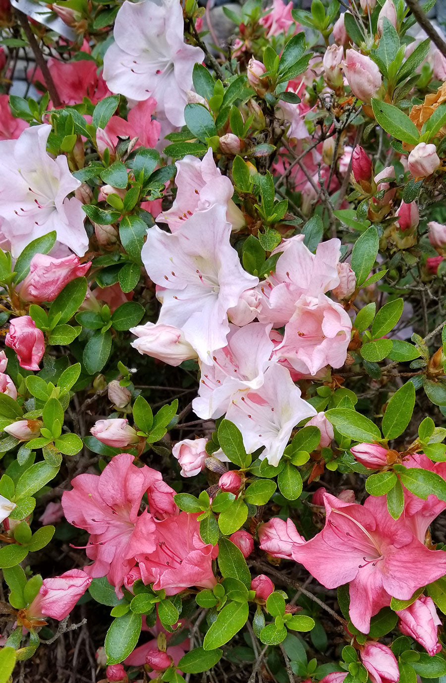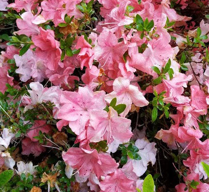 Soft coral-orange flowers are unique on this Satsuki azalea from Japan. The rounded petals can vary with stripes or solid pink or white colors on the same plant. Medium grower that is wider than tall.