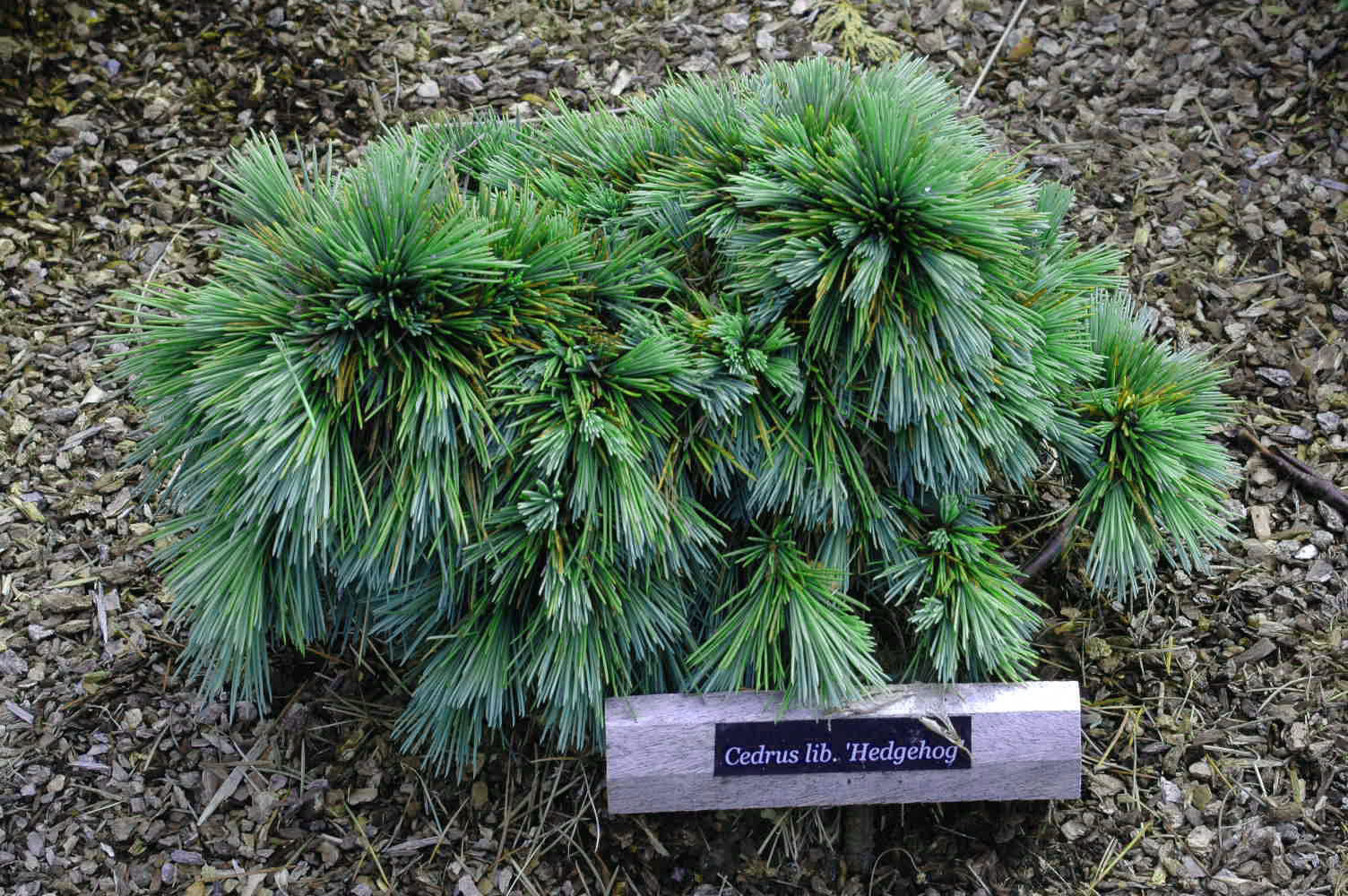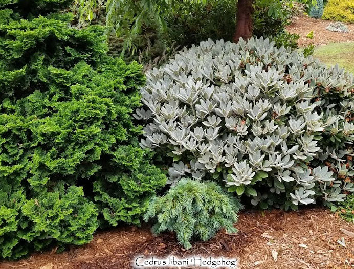 How cute is this plant! The photo is of our little Hedghog after 8 years of time and it is still a small little creature. It is very slow growing, and tends to spread horizontally with its blue-gray needles. We have never pruned ours, other than taking some wood off for grafting. Reported to be the most winter hardy of the true cedars. The 10 year size estimate is around 12 inches tall x 15 inches wide, although ours has a ways to go to be that size. Cedrus libani is native to mountainous areas of Lebanon, Syria and Turkey. 'Hedgehog' is probably a sport found on another witches broom of this cedar.