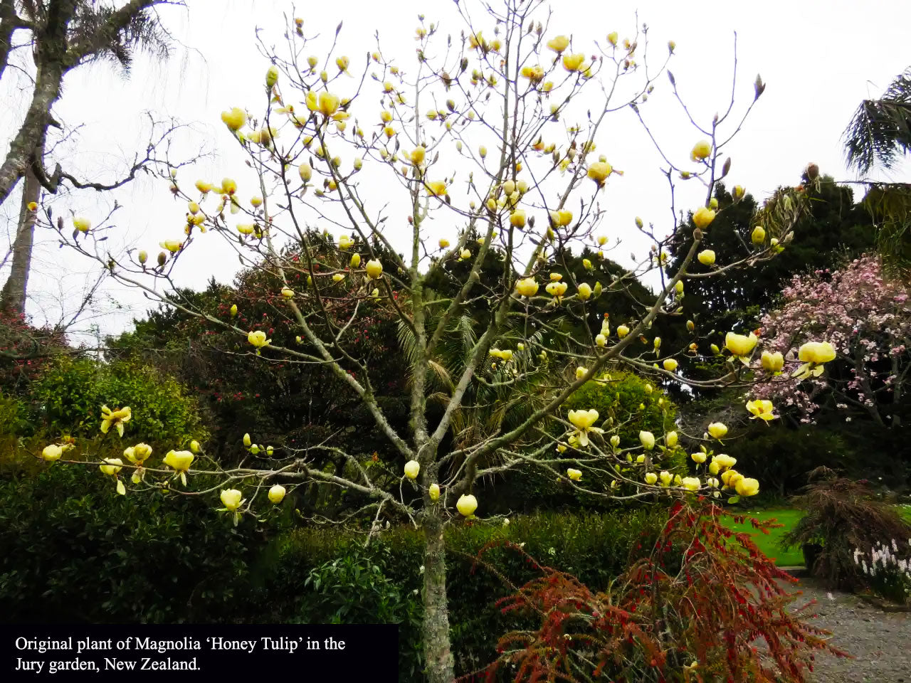 New from the prolific Magnolia hybridizers Felix and Mark Jury residing on the south island of New Zealand. This father and son team has been creating fabulous new magnolia hybrids for more than 50 years, and 'Honey Tulip' is no exception. This tree produces magnificent 6 inch golden-honey goblet-shaped flowers in late February into early March. The flower display is stunning on this smaller tree that will be 10-15 ft tall in time, making it a great choice for a yard specimen, or if planted in groups, a theme in a larger landscape. Rarely offered.