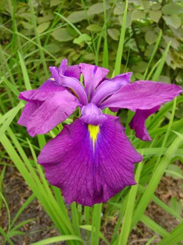 Rich purple flowers with a yellow throat adorn this showy Japanese Iris Blooming from March through June, this one likes plenty of water, and will thrive near a pond or stream with moist soils. Hardy from zone 4 to 9, it is deer resistant, and useful for cut flowers. Growing 3 ft tall, it will spread 2-3 ft wide over time. One of the last of the irises to bloom.