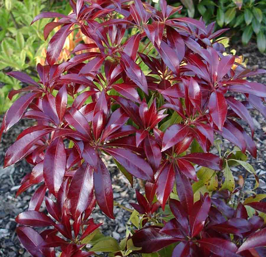 Two toned pink and white flowers in early spring, then dramatic rich dark-red leaves come out, making quite a show. A great contrast plant for those beds with green leaved plants. Easy to grow, and often noticed.