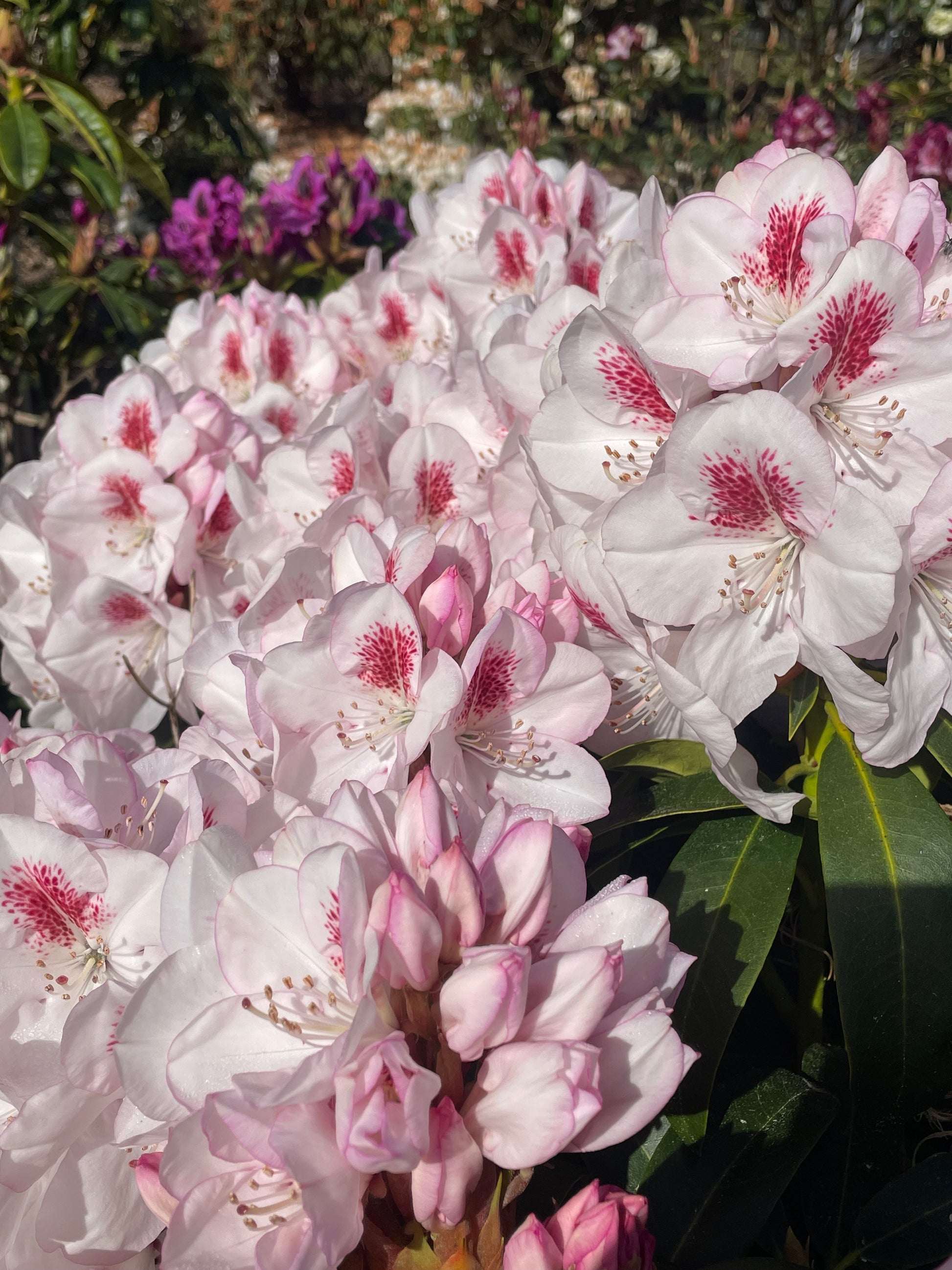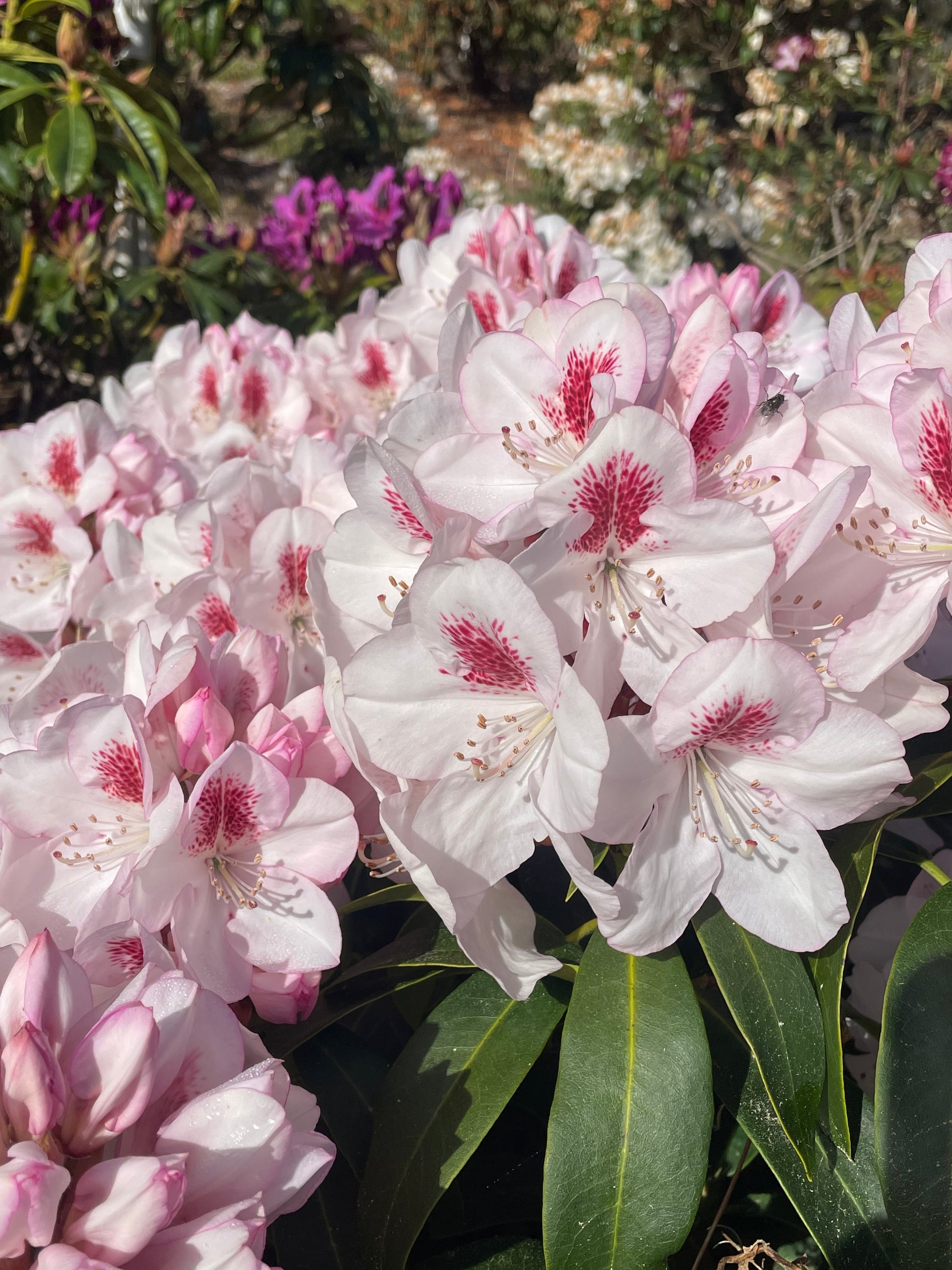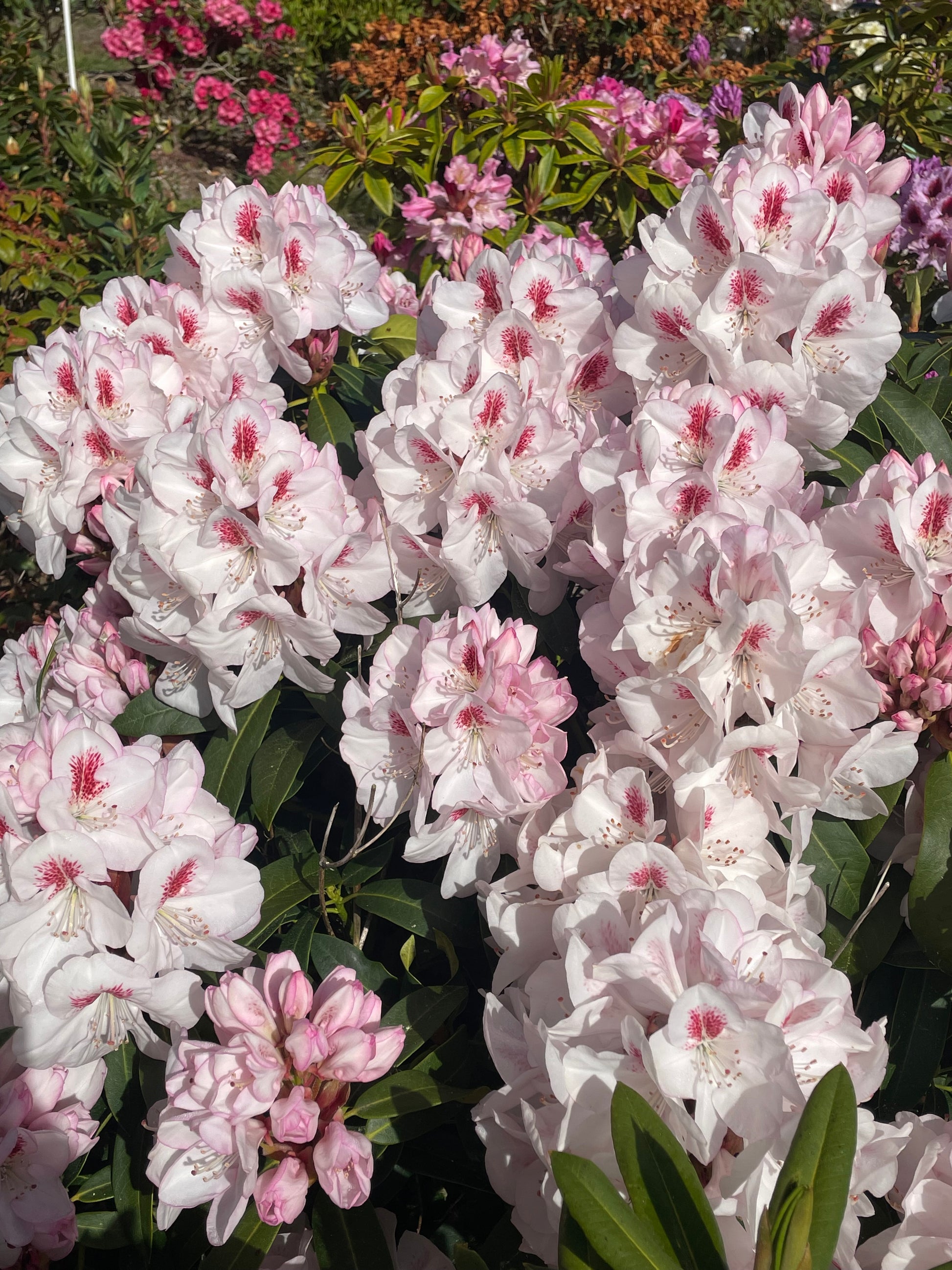 The white flowers with red markings create a feeling of formality when Lady de Rothschild blooms in late April. The plant is vigorous and grows 6-8 ft. in ten years. This cultivar in flower is so impressive, it often is called 'the perfect rhododendron'.