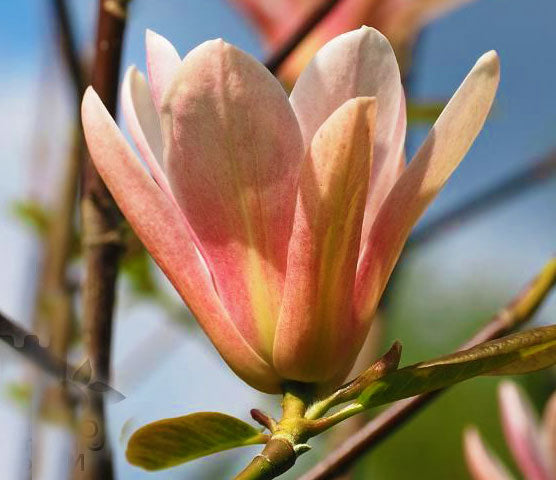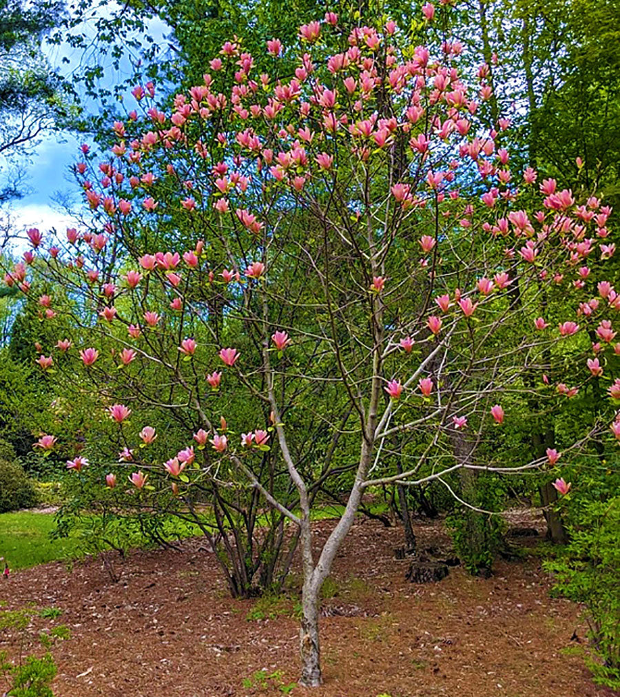 A fairly new magnolia hybrid that has a complex parentage with lovely coral blooms that are striped with yellow and green. The tree blooms heavily and will eventually grow to 20 ft tall and 10 ft wide. The flowers come out as the foliage emerges in mid spring. The large pointy leaves turn coppery-bronze in the autumn. This is a relatively low maintenance tree, and should only be pruned after flowering to avoid removing any of the current season's flowers. It has no significant negative characteristics.