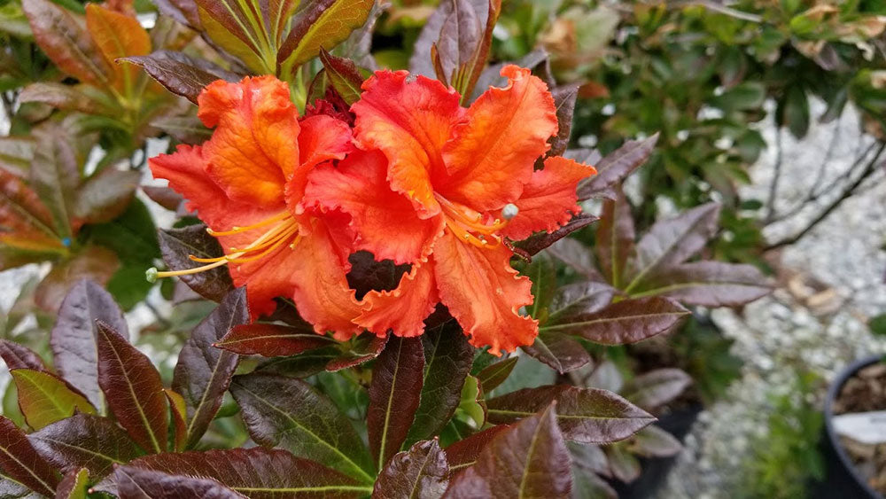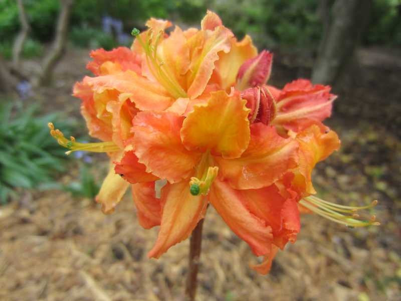 Rich orange and red, ball shaped flower trusses open against dark-bronze-green leaves, causing socks to be knocked off. The plant stays fairly compact and low, so will add to the spring beauty in front of taller shrubs. I would call this color 'tutti frutti'.