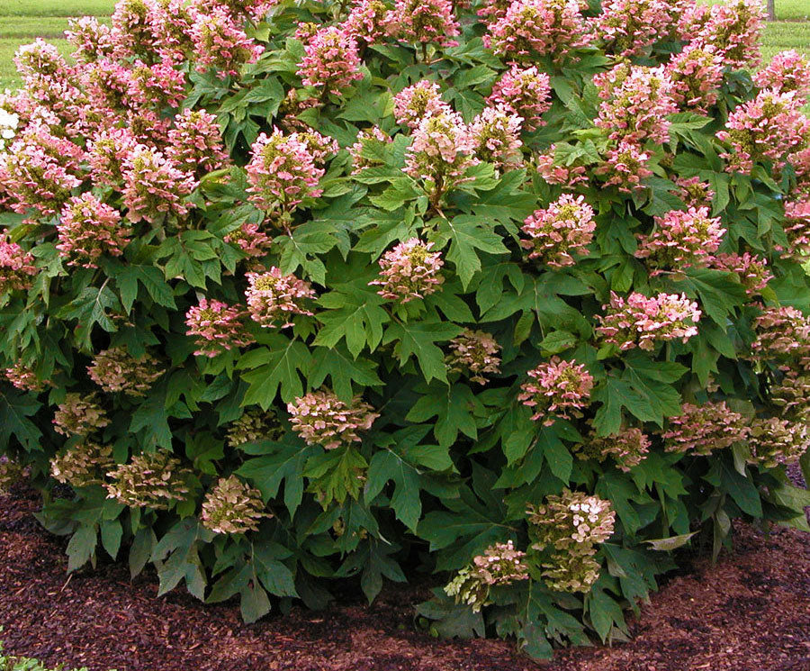 Everyone loves Oakleaf Hydrangeas with their attractive foliage and flowers. Here is a new quercifolia type that iis dwarf and compact. This new introduction by the U.S. National Arboretum has very dark-green leaves that turn mahogany-red in the fall. The flowers start out white, then turn pink at summer's end, then tan before dropping. Easy to grow with excellent ornamental qualities.