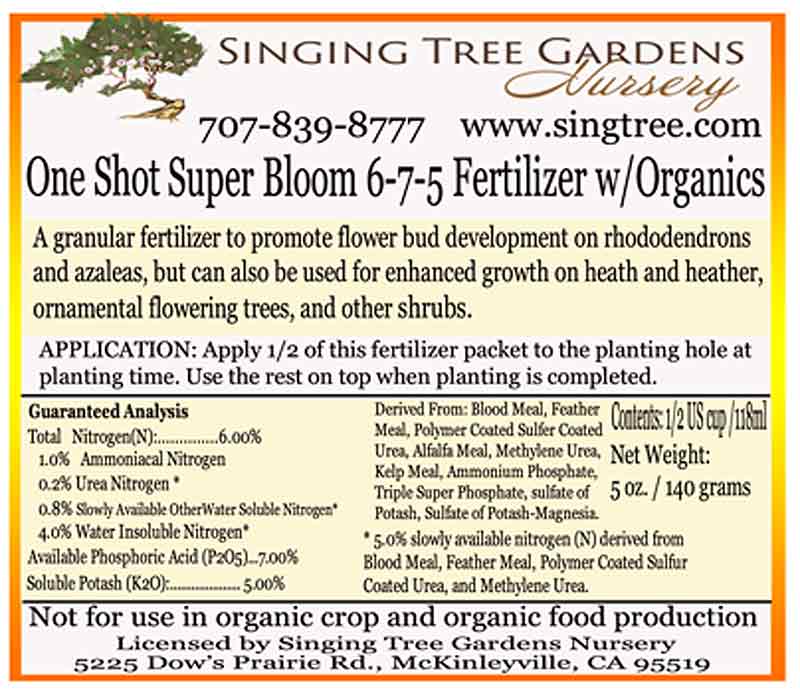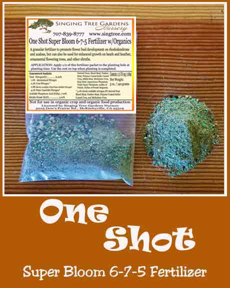 In order to get your off the a great start, plus promote flower bud production for the brightest colors and largest flowers, we suggest using our proprietary Super Bloom fertilizer. This granular fertilizer was created over 40 years ago by master fertilizer chemists especially for acid loving ornamental woody plants like rhododendrons, azaleas, heath and heather, and other flowering plants and trees. With over 20 ingredients, this plant food will be all your plants needs to perform at its best.