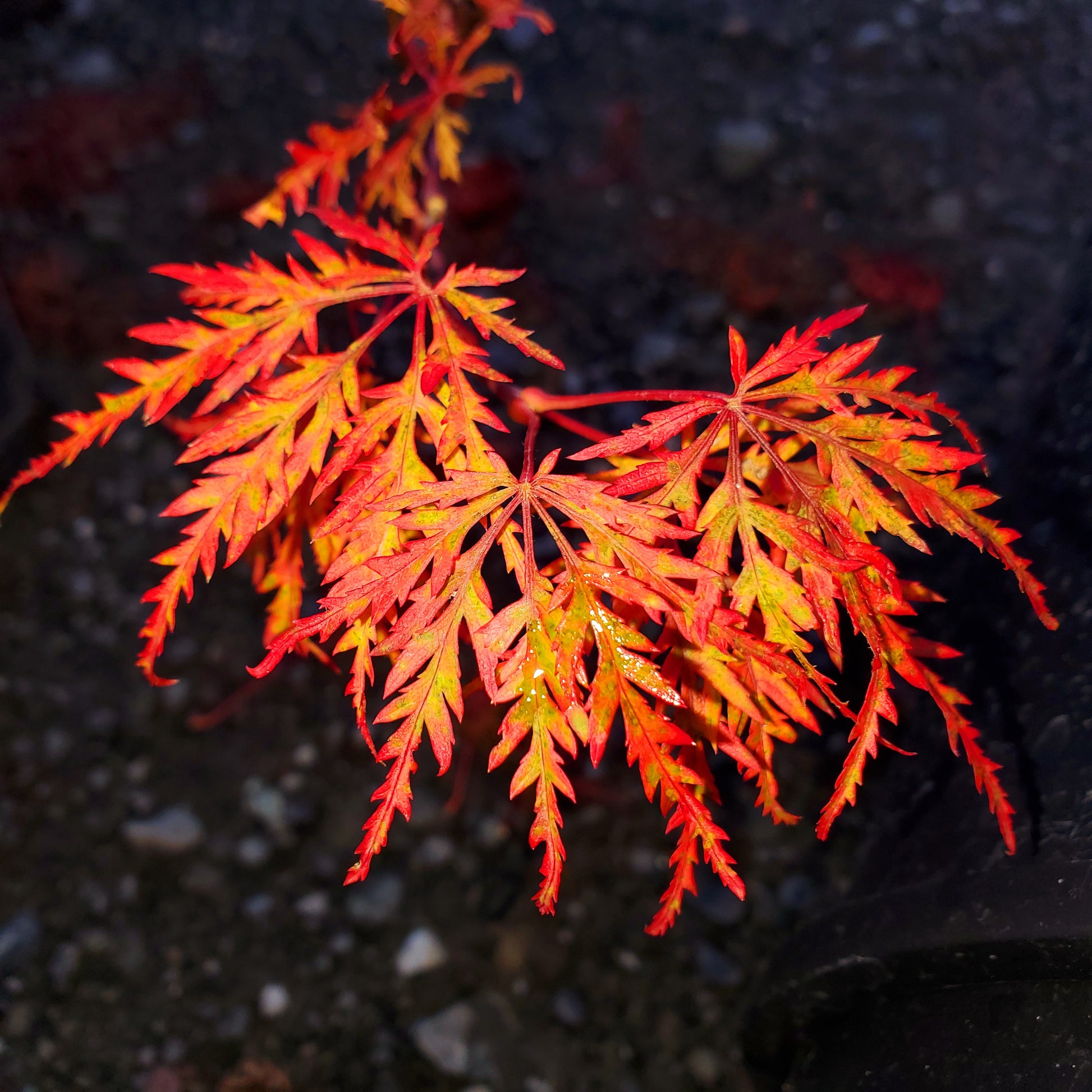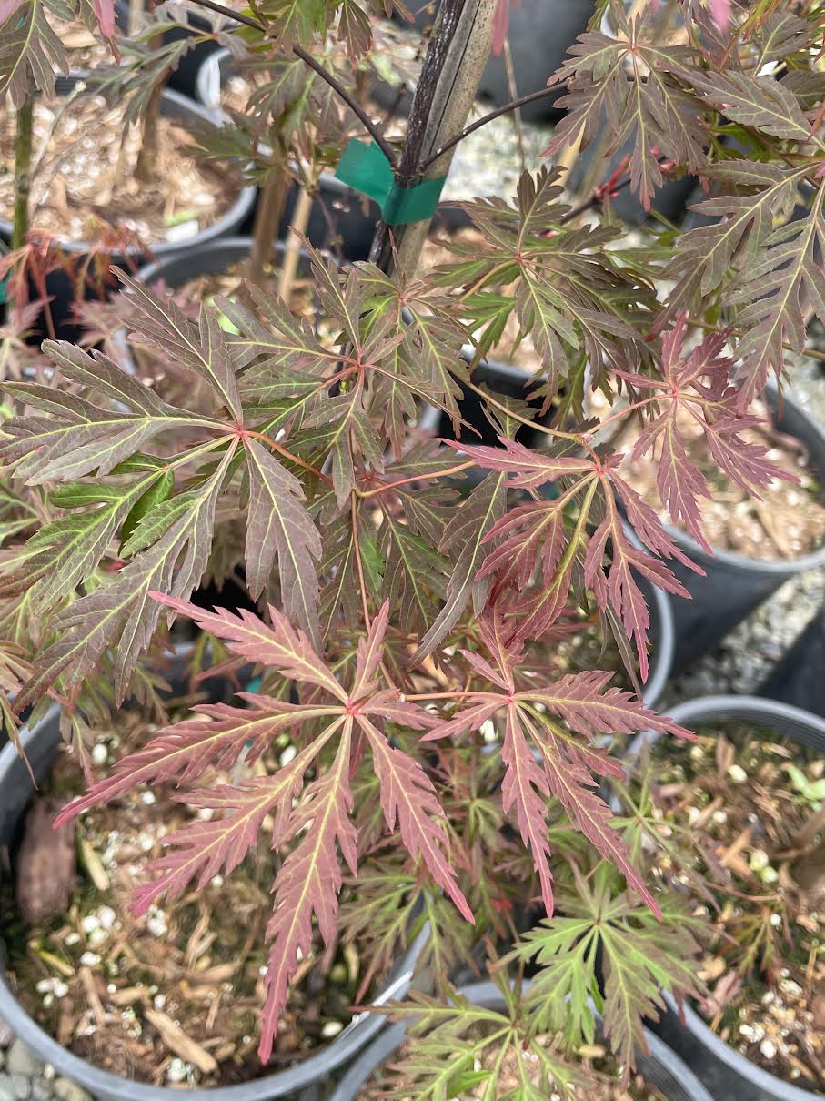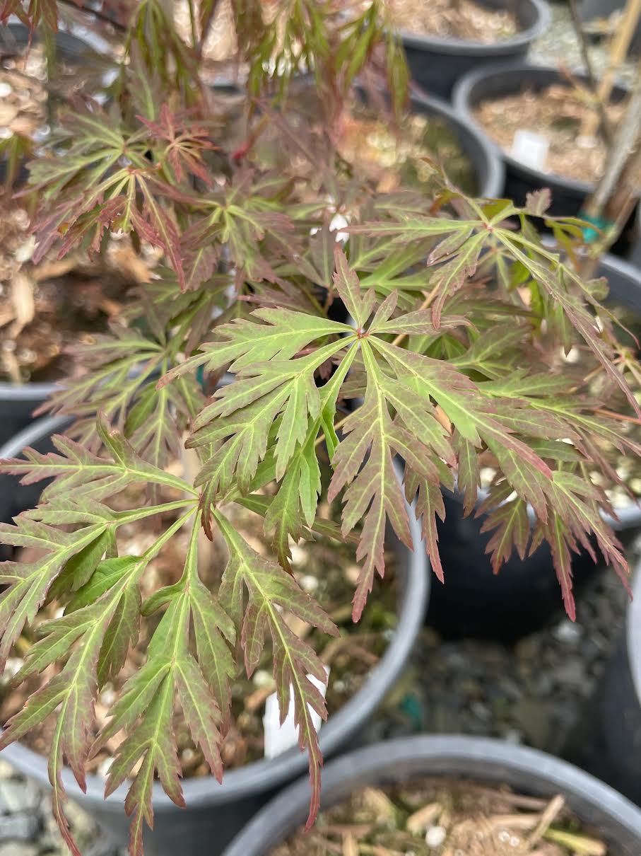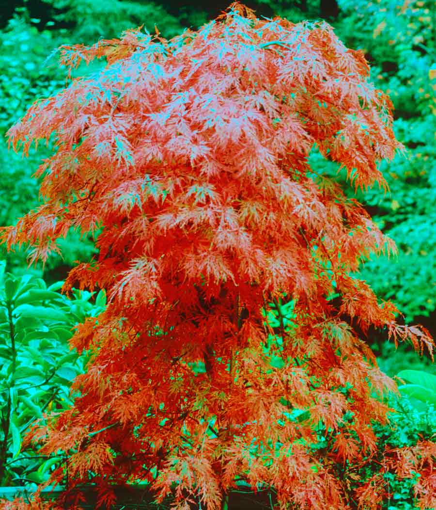 Really living up to its name, Acer palmatum 'Orangeola' is the most orange foliaged Japanese maple that we know, especially in the fall when the red-orange leaves turn to the color of a Valencia orange. Wow! What a color. This cultivar is one that grows taller than wide, making it a great selection for growing in a container on your deck or patio. This dissectum type tree has a lacy, soft appearance to the landscape.