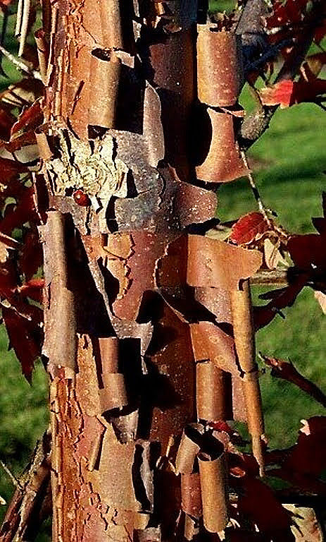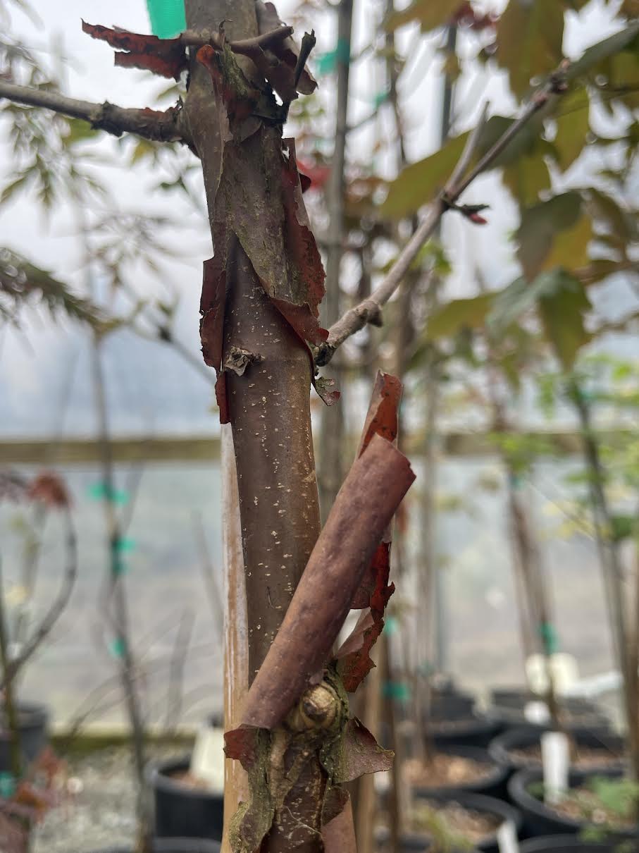 From central and western China, this slender tree to 40 ft. is considered a gem of the maple family and indeed one of the most beautiful of all small trees. Its outstanding feature is the texture and color of the bark, which peels but also holds on in curls, revealing smooth, cinnamon red limbs and trunk. The leaves of 3 elliptical leaflets turn orange, scarlet and crimson in autumn. The winged fruits have unusually large seeds. Recipient of the Gold Medal Plant Award by the Pennsylvania Horticultural Society.