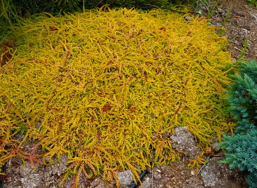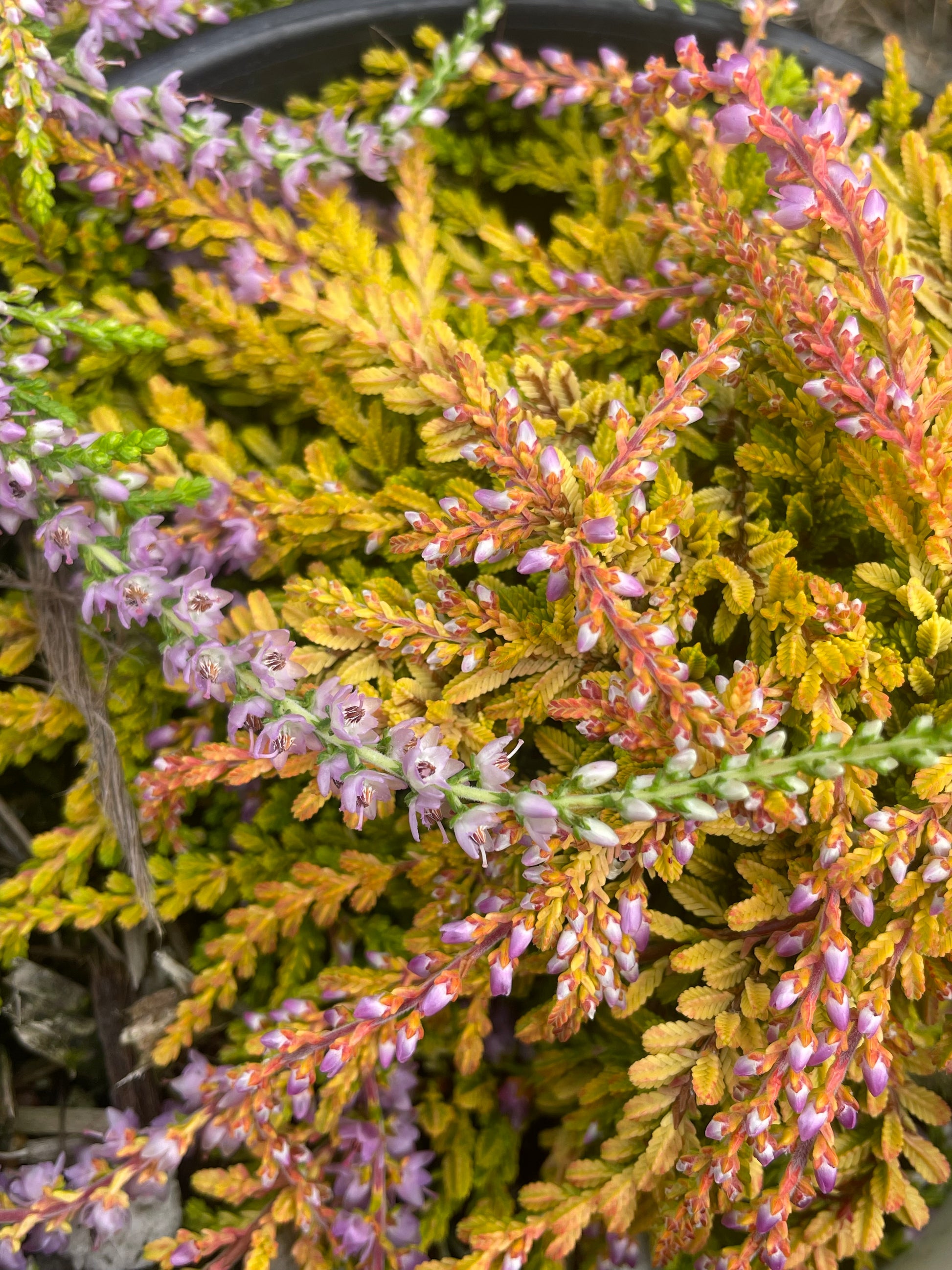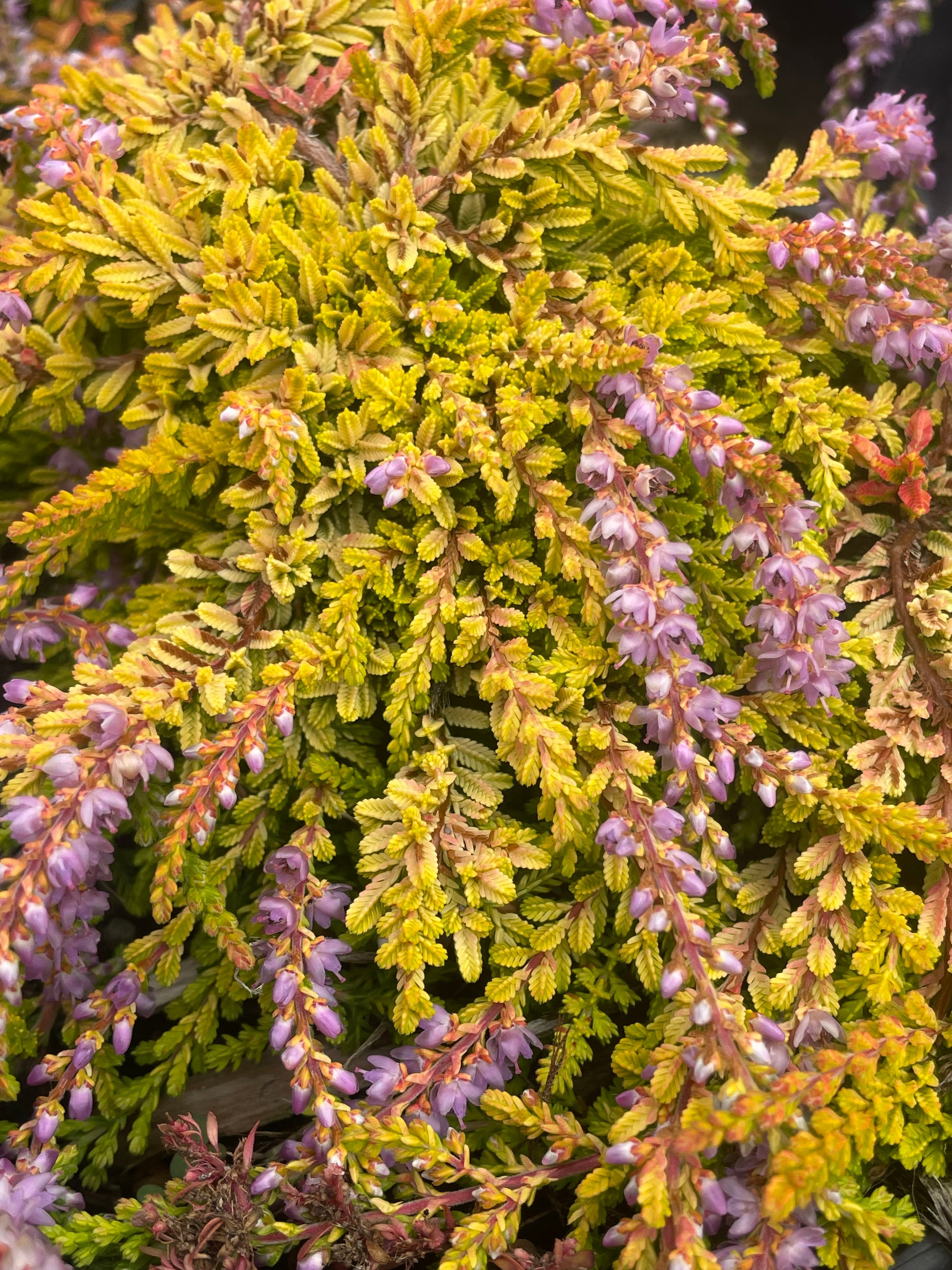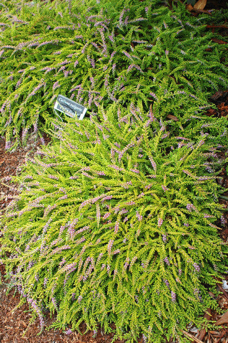 You will love this nice ground cover heather that has pale lavender flowers from July through September. The foliage is bright gold with green throughout the year. Creeps and spreads making a nice small groundcover. Recommended. American origin.