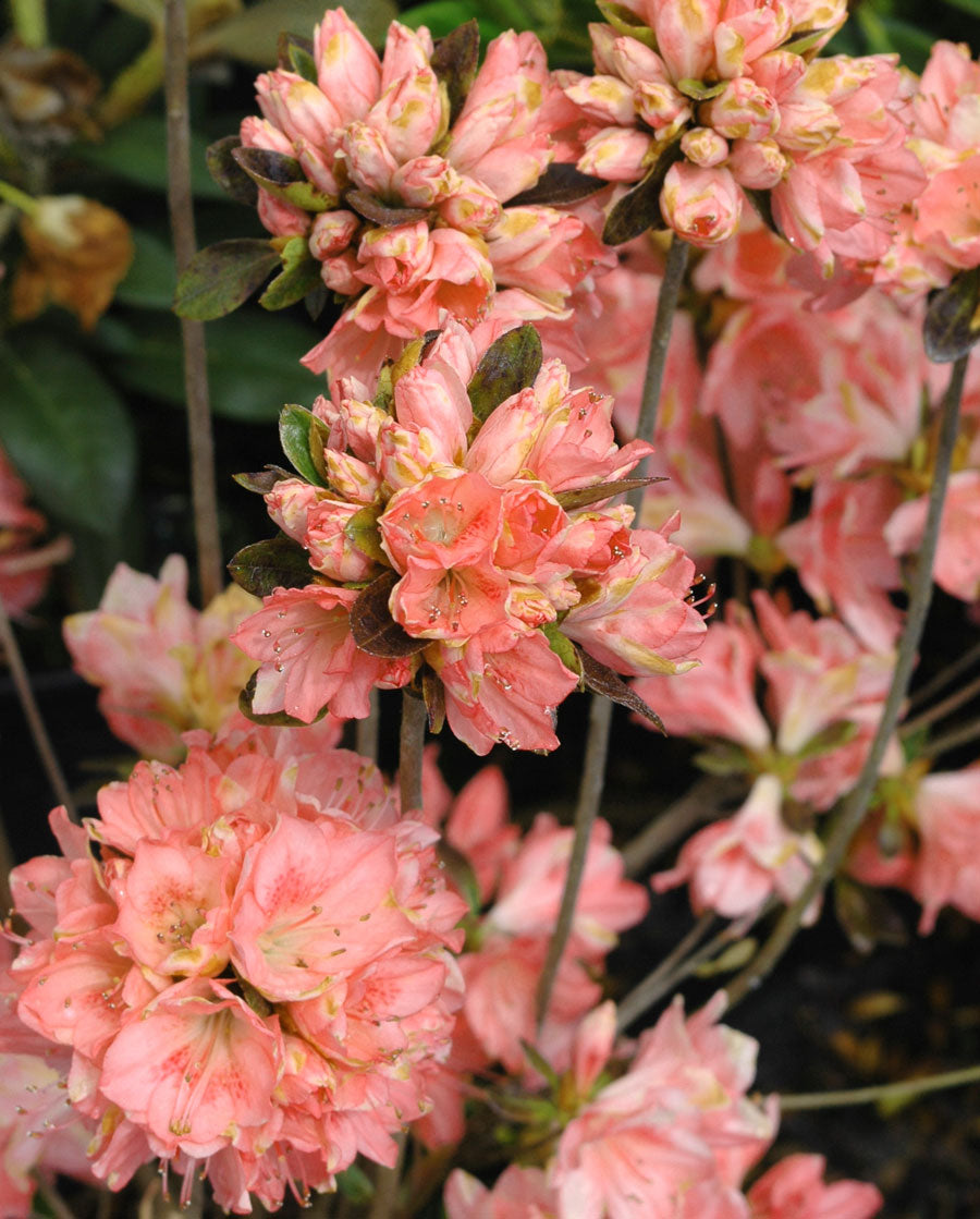 Lovely double flowers in clusters create a beautiful effect on this interesting Linwood hybrid evergreen azalea. It is quite hardy, and will grow into a nice mound in the garden. All of the Linwood hybrid azaleas were developed in the 1960's for the florist trade, and many like 'Peach fuzz' perform even better as a garden azalea.