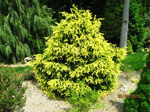 Found along a roadside in the 1990's by Arthur Perry, this tree brightens up any garden in spring with its intense butter-yellow new foliage. As the season progresses, the gold color turns to green. Growing to about 4 ft tall and 2 ft wide in 10 years, it makes a fat pyramidal shape. Plant with a blue foliage plant for a stunning spring show. Best in full sun for the color. Thrives in well drained soil with lots of organic amendments. Hardy to -30 deg F, zone 3.