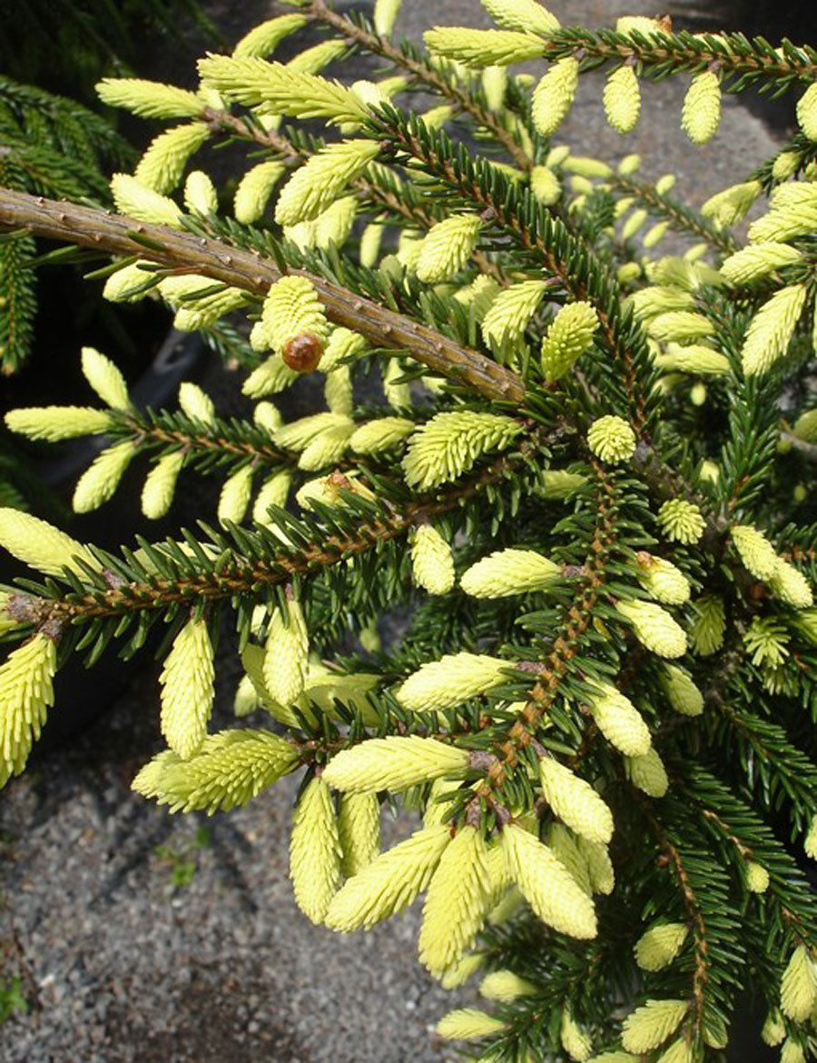 There are a few of these bright yellow spring growth forms of Oriental spruce, but this one's claim to fame is that the brilliant yellow color lasts longer than other cultivars. Plant as a specimen where it can take center stage, and you will not be disappointed. The tree, found by the John Vermuelen Nursery in New Jersey, will make a narrow pyramid 6 ft tall and 4 ft wide in 10 years time. In summer, the bright new growth turns green.