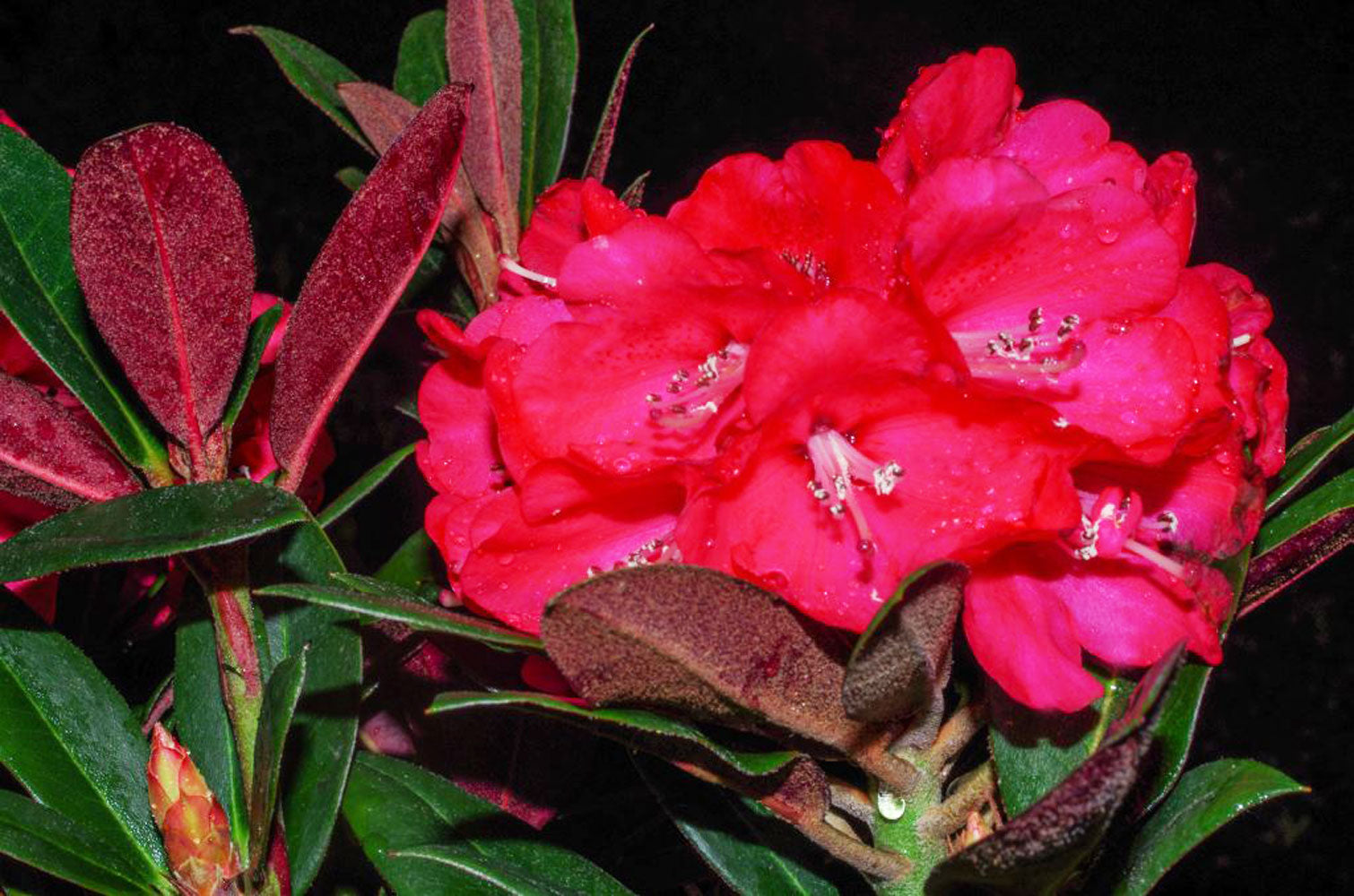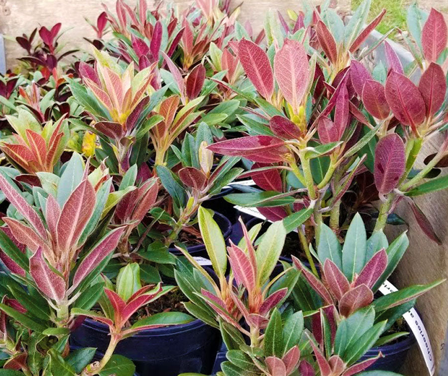 For the foliage lovers, this unique hybrid has rich red coloration on the undersides of the leaves. It has been suggested that one should plant this one up on a bank or mound so the red color on the undersides of the leaves can be easily seen. The flowers are red, and the plant will bloom in April. A nice compact plant that will be the star of your garden! Hardy to zone 8.