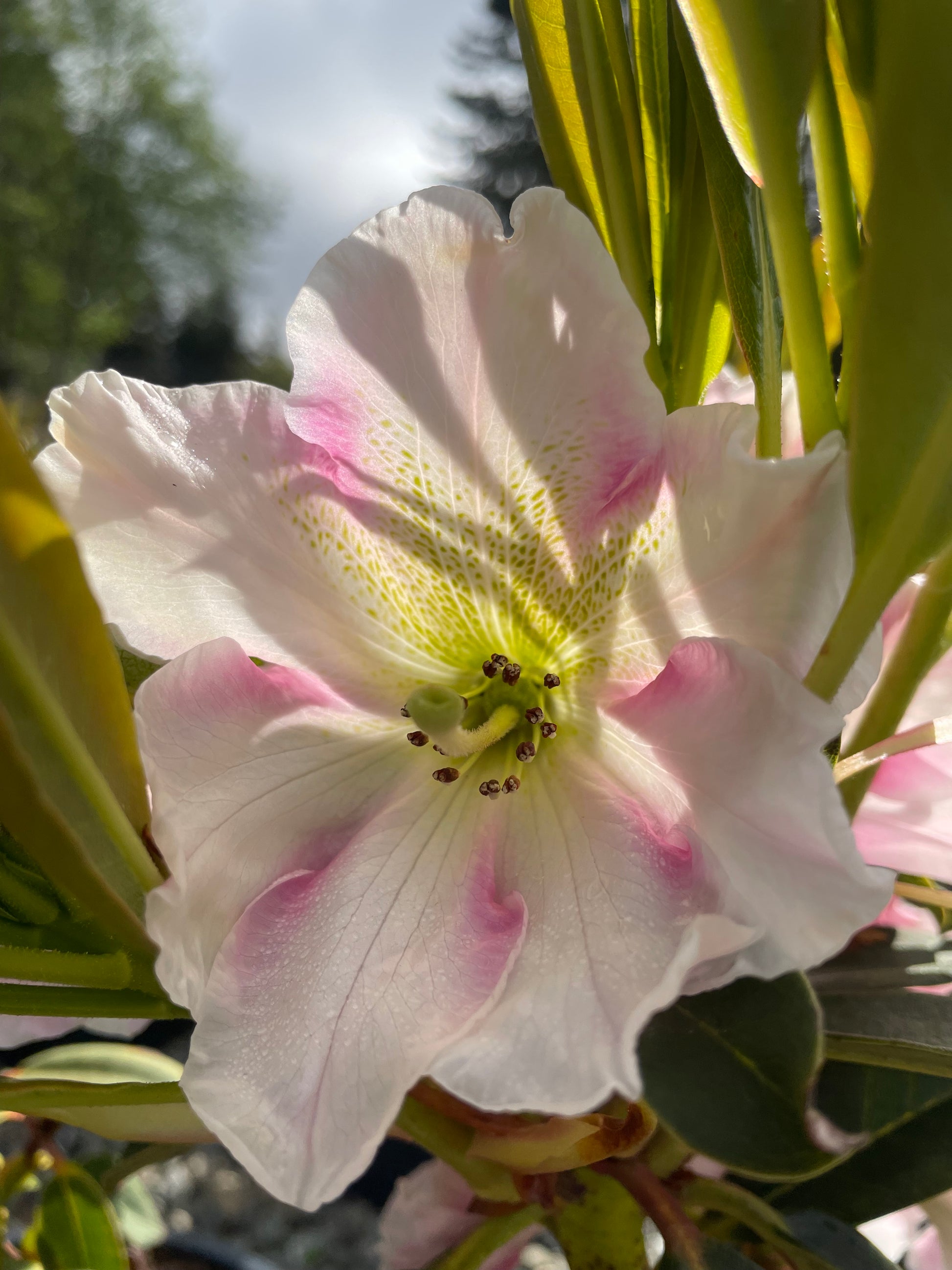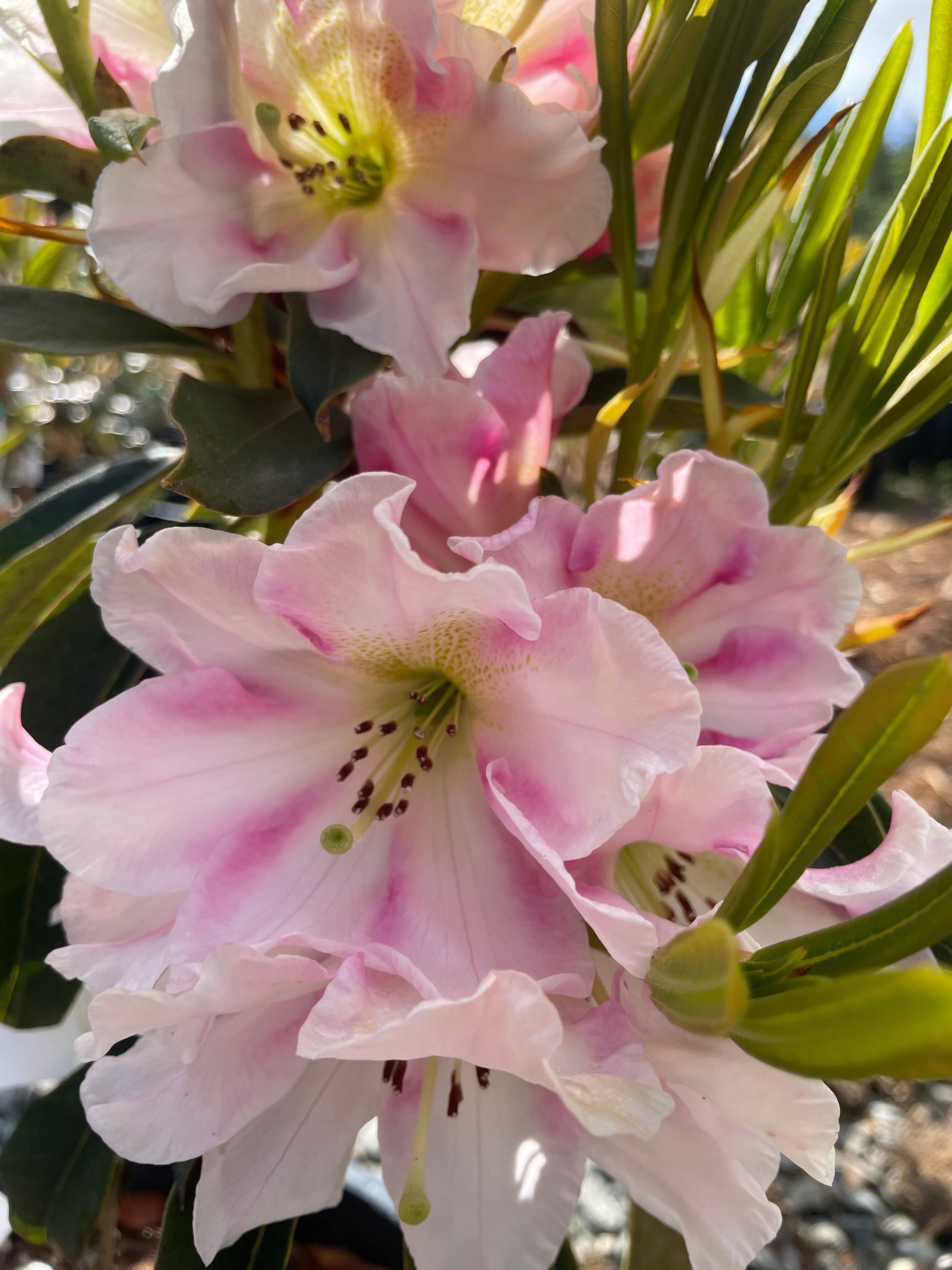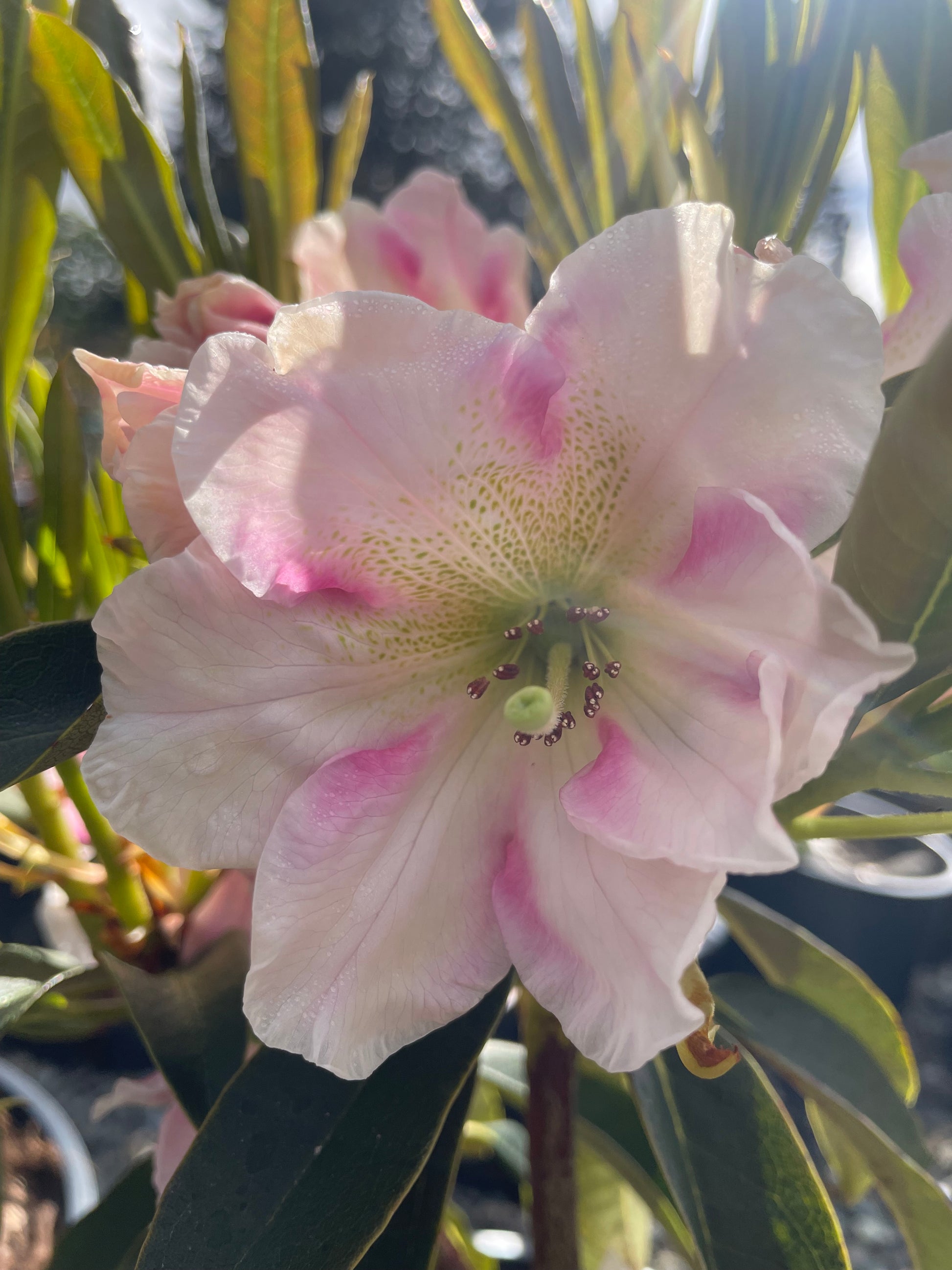 Large and fragrant trusses of pink-white-yellow cover this new hybrid by Singing Tree Gardens in mid to late April. Sister to 'Scented Sunrise'. Will grow to 6-7 ft tall and wide in 10 years. Trusses cut and brought indoors will perfume the house nicely. Hardy to zone 8.