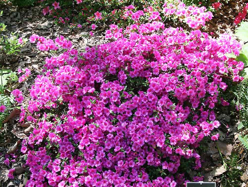 A rhododendron species that looks like an evergreen azalea. The growth habit is low and mounding, and the leaves small and glossy dark green. Native to Japan, growing on steep mountain slopes, and adaptable to a wide range of conditions. The reddish-purple flowers cover the plant in April - May. Hardy to zone 6.