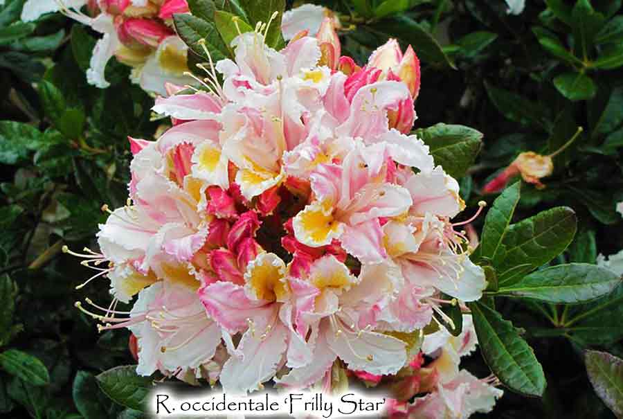 Another of the Smith-Mossman discoveries found near Crescent City, CA. This one has colorful flowers that have very frilly edges. The fragrance will be heavy like all of the R. occidentale, and the shrub will grow fairly large. There were many numbered selections they found, and if they received a name, then we can assume that it was one of the best forms. Deciduous.