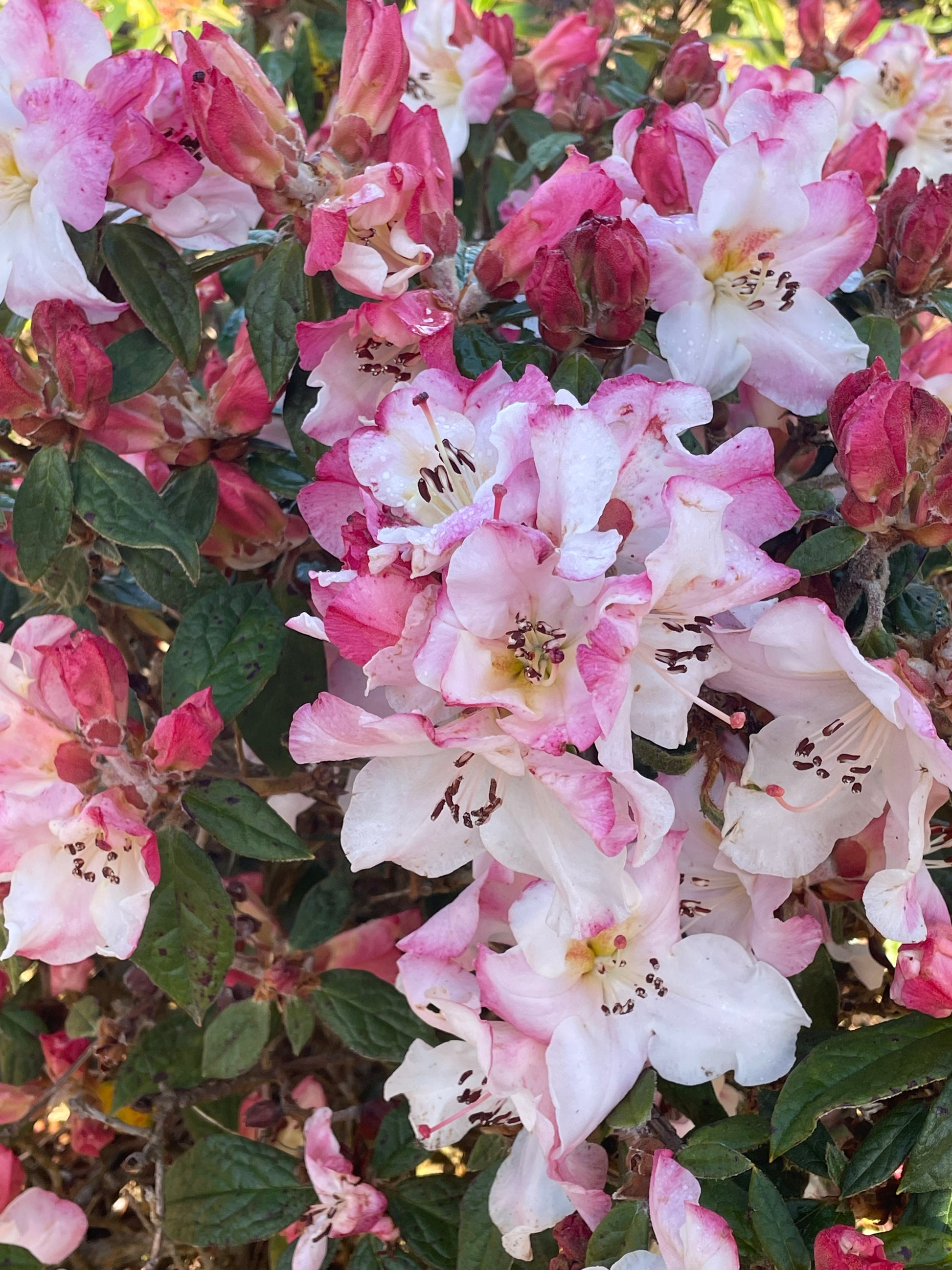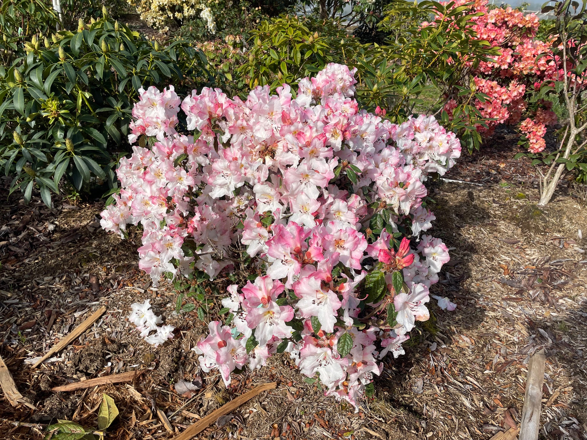 Low growing FRAGRANT rhododendron belonging to the section Maddenii. The most noticable characheristic is the leaves being short and angular with heavy bullate testure on top, and with some small hairs along the leaf edges. The pink-white-yellow flower colors add interest when blooming, and the fragrance is sweet. The most unique characteristic is its low and compact habit, growing to 2 ft tall x 4 ft wide in 10 years.