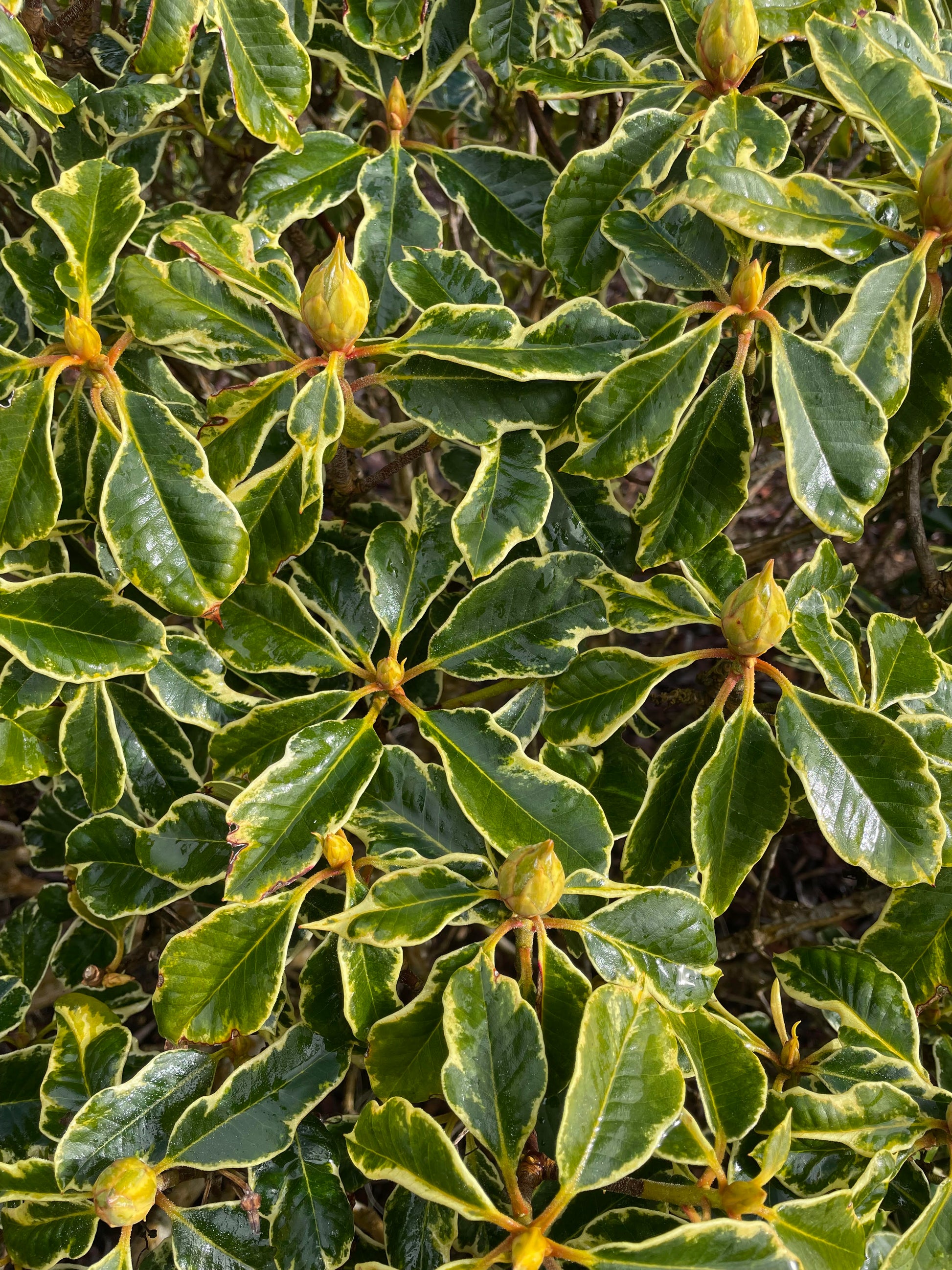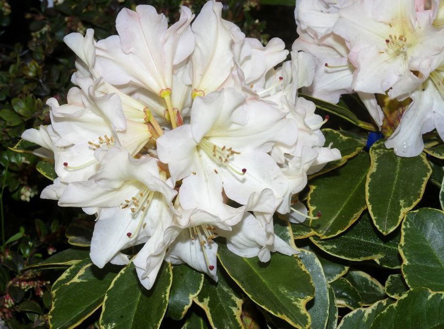We were given this variegated form of the rhododendron 'Unique' by the Thompson Nursery in Oregon. Every leaf is dark-green with a bright yellow edging. The plant grows slower than R. 'Unique', but the flowers are much the same, white flushed pink with a bit of yellow in the throat. Tropical colors! The variegation makes the plant stand out in the landscape. Hardy to zone 6b.