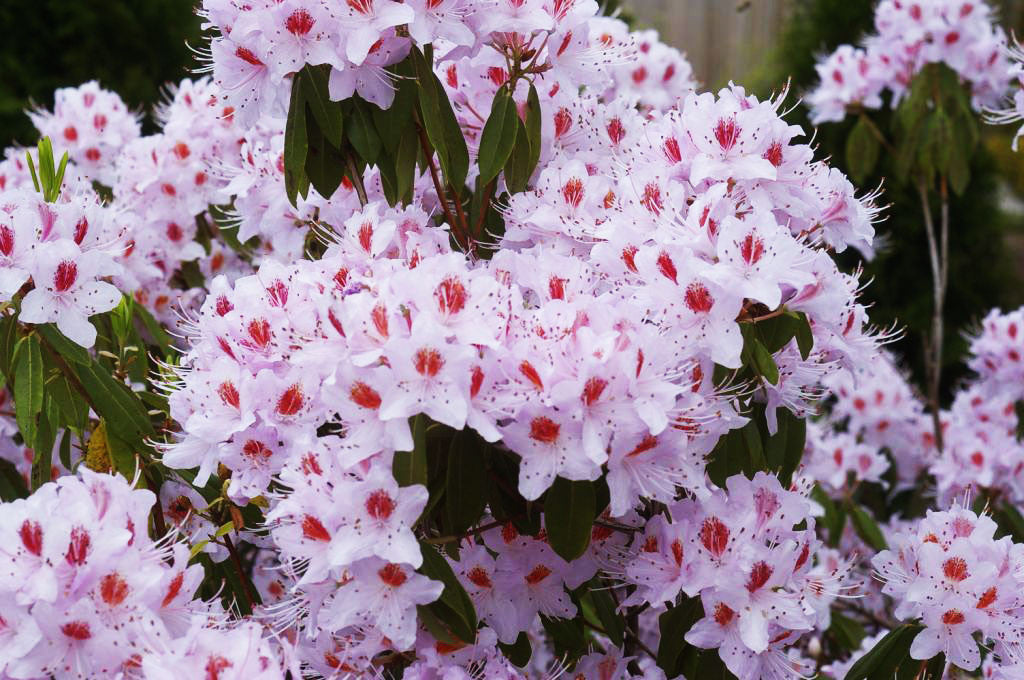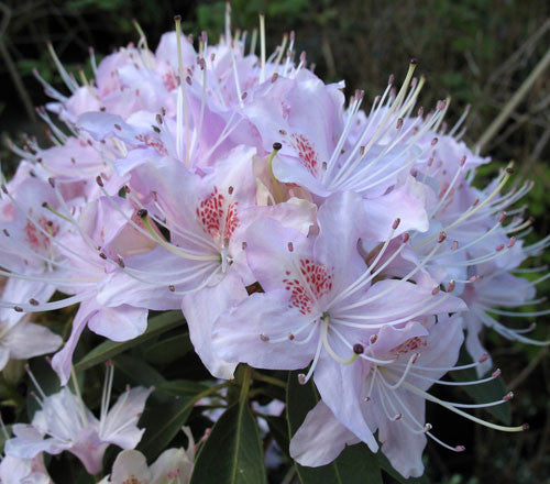 Native to Myanmar and many provinces in China, this lovely rhododendron has loads of white flowers with red spotting, and even a nice light pink blush around the edge. The pistils are long and showy, giving the bloom a sparkly appearance. In most years the flowers cover all of the foliage and make a dramatic display. The leaves are small and pointed on a plant that grows between 4 and 6 feet tall in 10 years. Grows at around 10,000 ft in its native lands. Hardy to 0 deg F.
