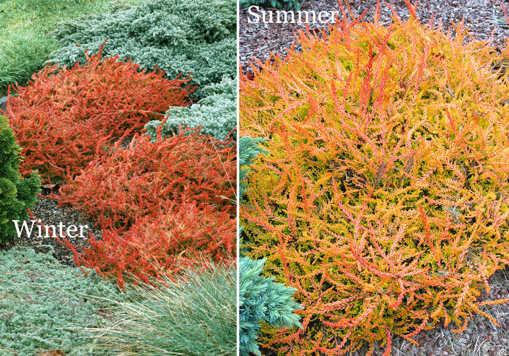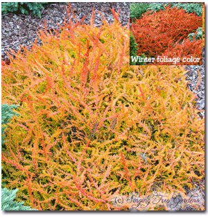 Another Calluna that is more valuable as a foliage plant than for its flowers. Beautiful, striking golden foliage with red tints add interest and contrast to the garden throughout spring and summer, then in the fall the leaves begin to turn more orange until mid winter when it is a fiery red-orange. The lavender flowers appear in July through October. Rounded compact habit. Named after the eldest child of Charles Chapman, Birmingham, England. Winner of the Award of Garden Merit trophy.