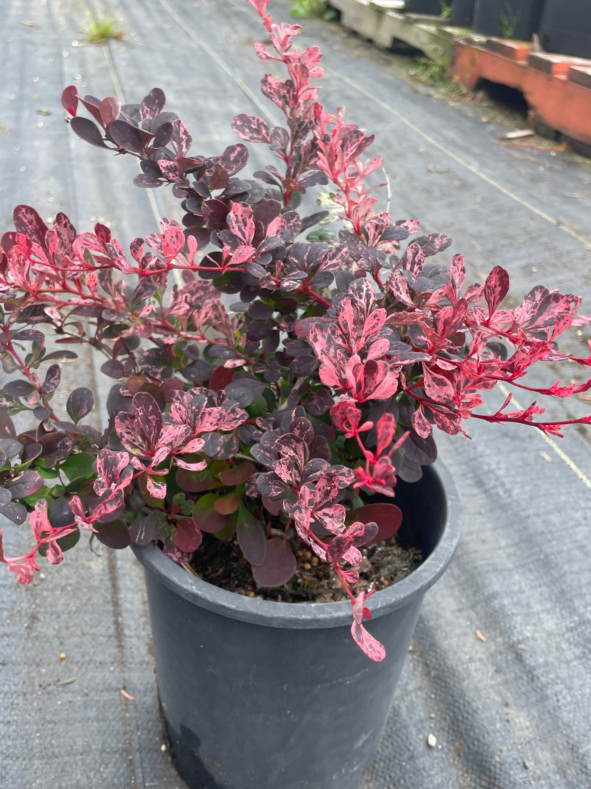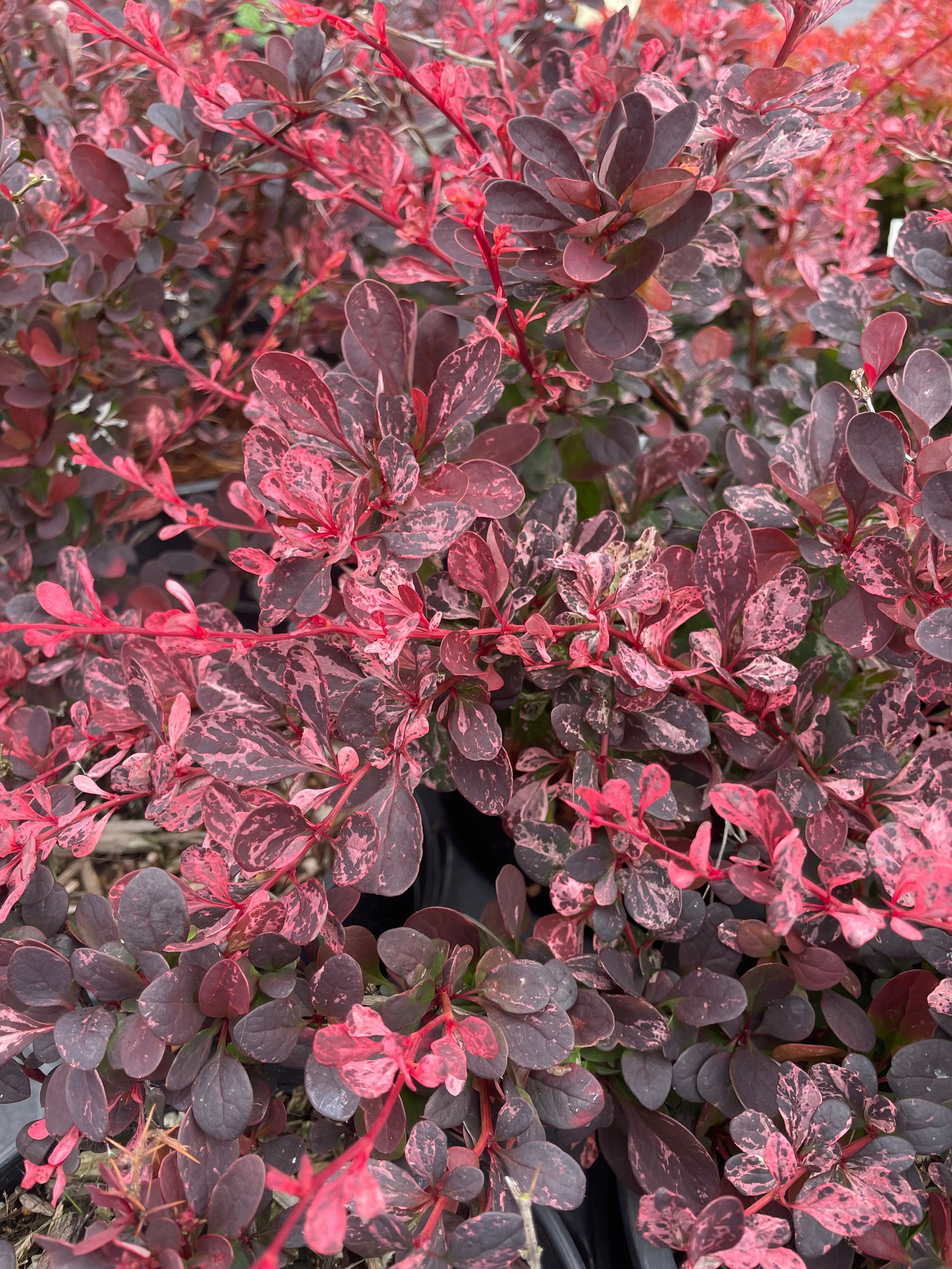 This variegated Barberry is a brighter foliage plant than other cultivars due to the light pink leaves mixed with the red. The plant grows taller than wide, and will make a good hedge. The yellow flowers appear in summer, but are inconspicuous. Deer resistant.