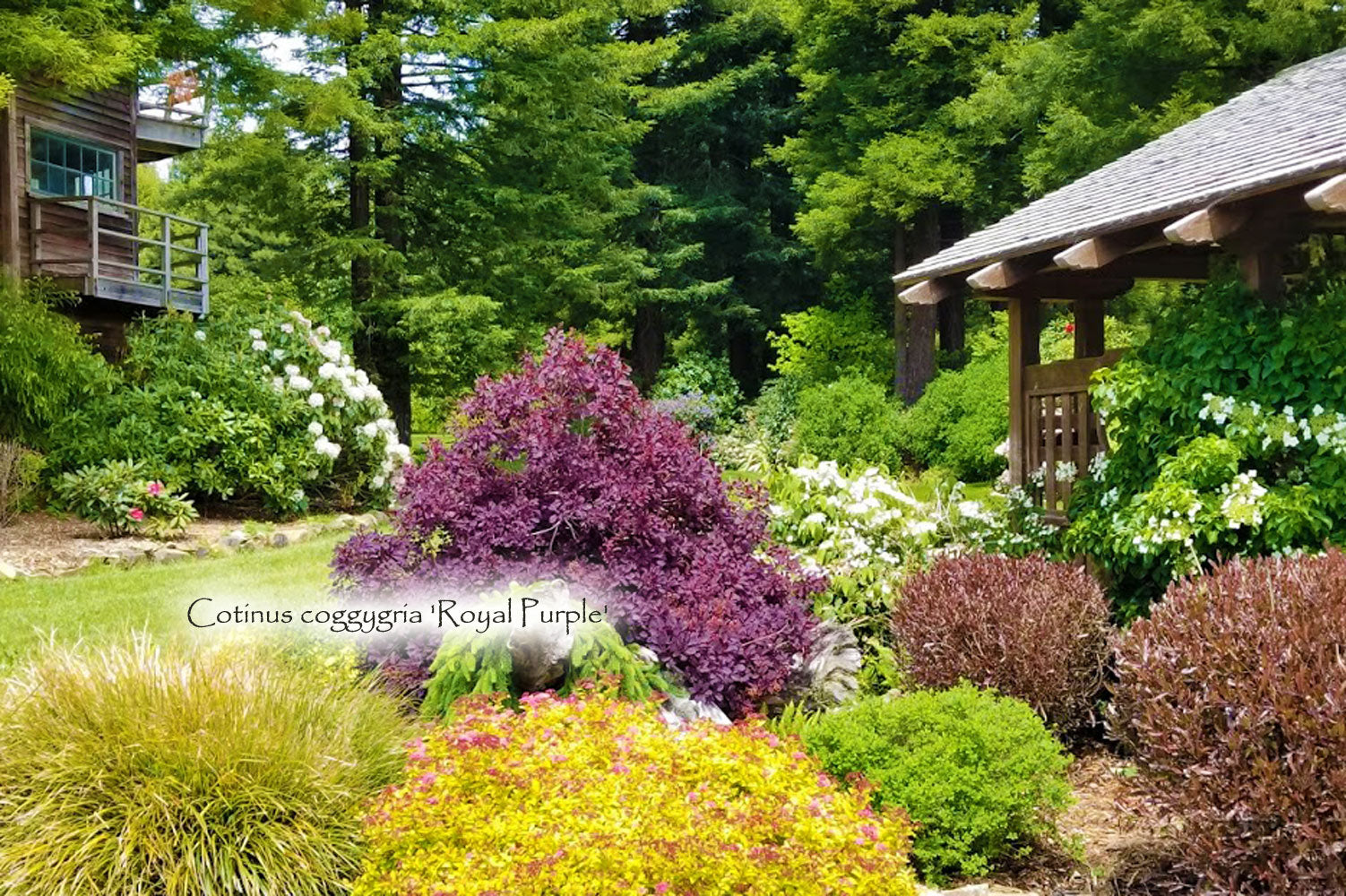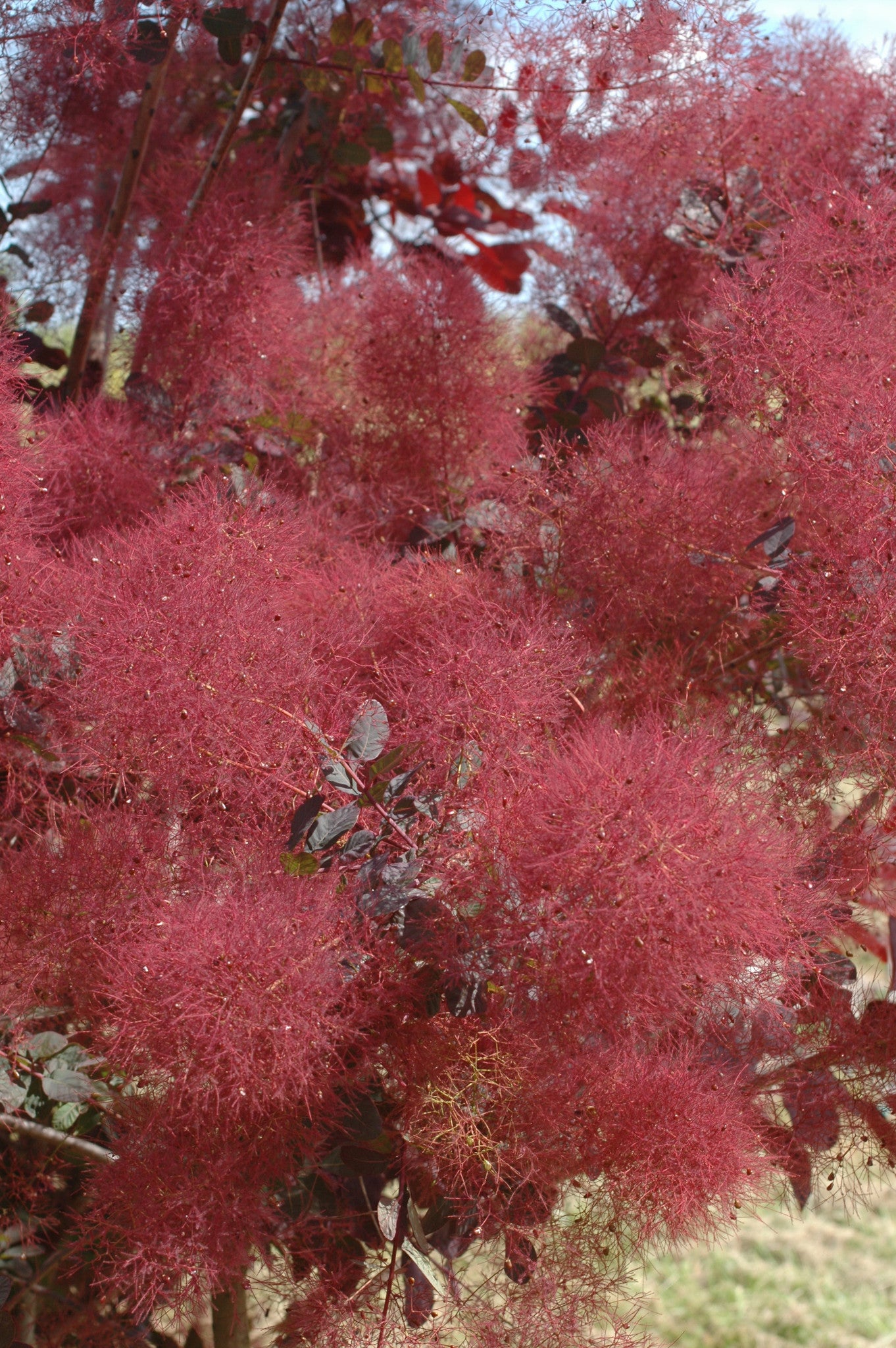 Purple Smoketree. A very attractive shrub with deep purple leaves that hold color throughout the summer. The native range of this attractive shrub extends from southern Europe to central China. It grows into a rounded bush about 12 ft. tall with broadly oval leaves. The numerous plume-like panicles of tiny bronze-pink flowers fading to grayish purple are a stunning feature in summer...a look of "smoke". The foliage turns red in autumn.