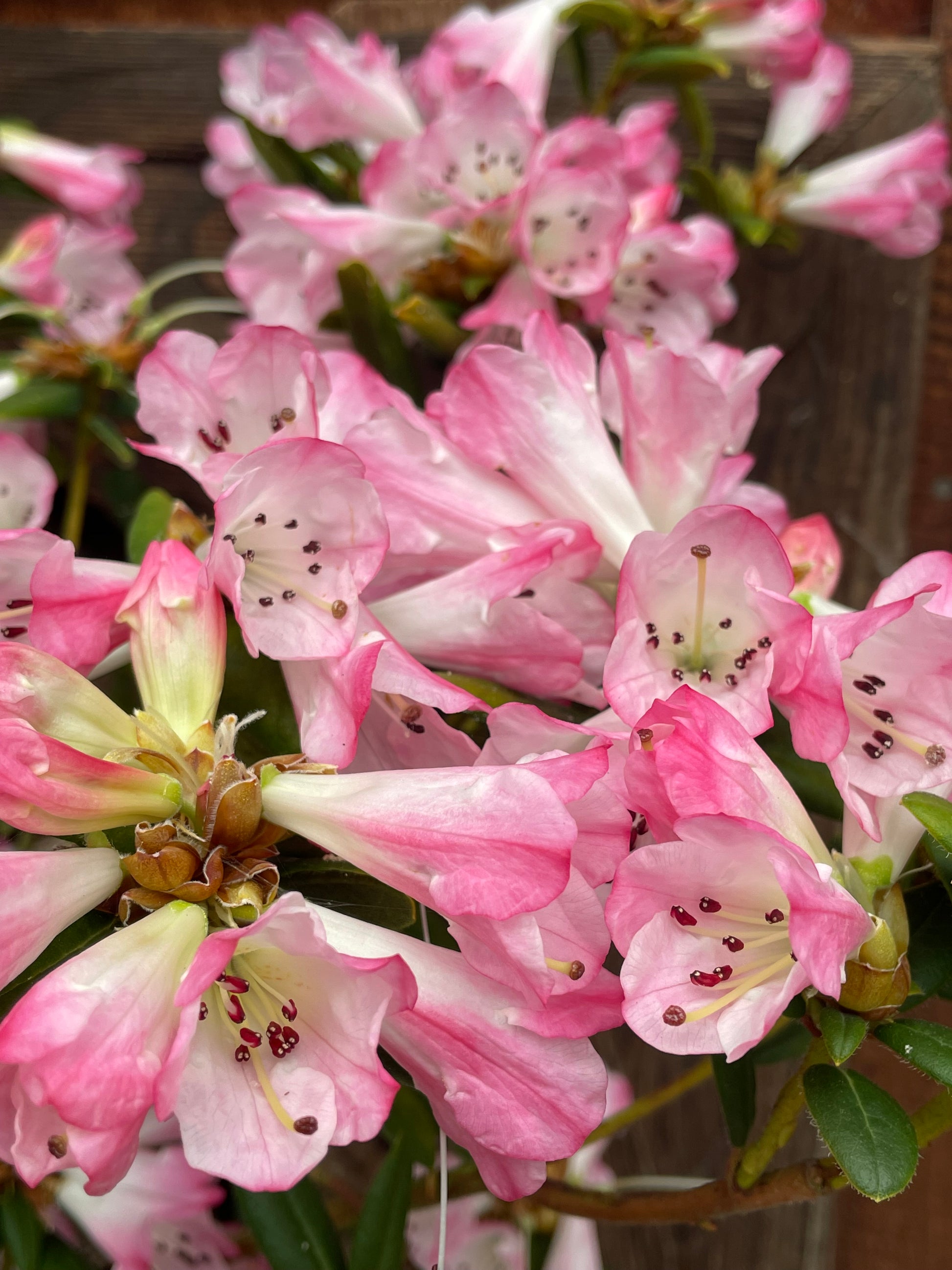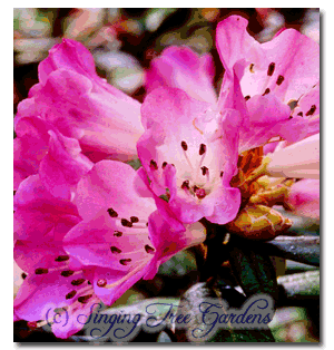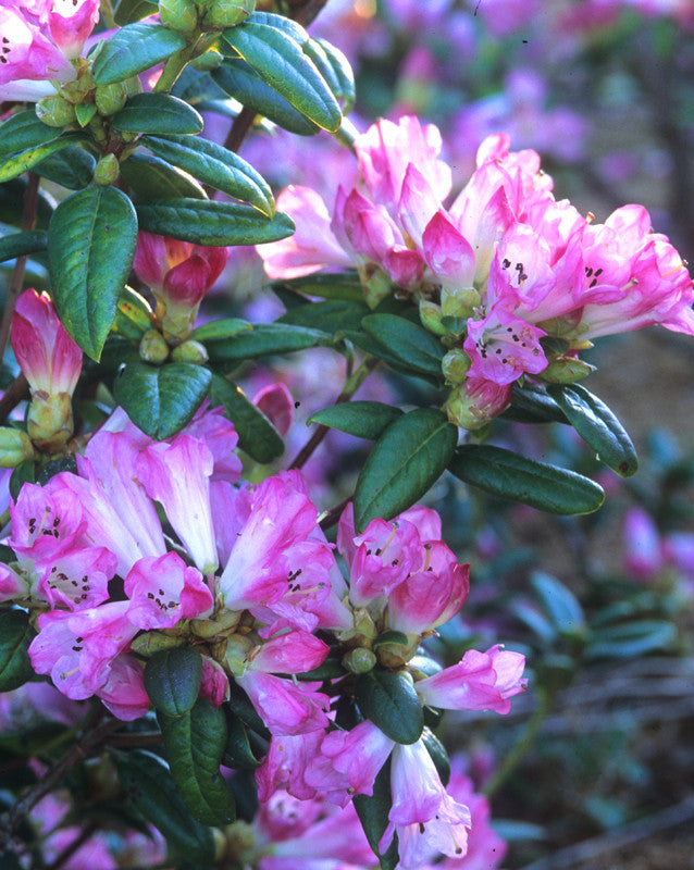 R. 'Seta' announces the start of the rhododendron bloom every year when it begins to show color in early February. The lovely pink and white bells really light up the drab landscape of winter. A very useful plant, and one of our favorites.